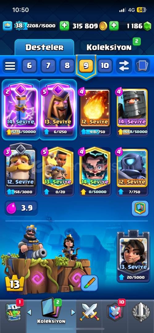 Hesapta 3 tane 14 seviye karakter var 1200 taş var 117 kart vardır 7200 kupa 2 tane evrim var