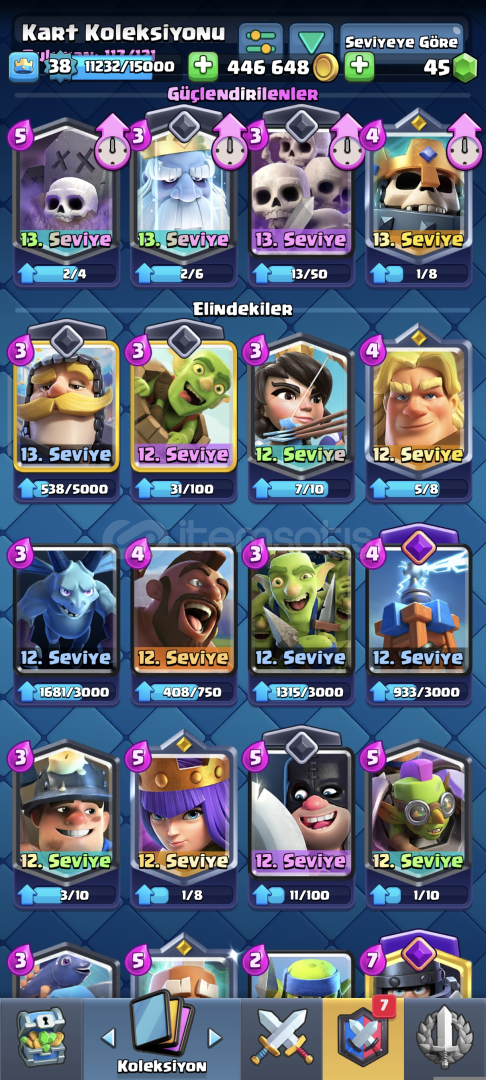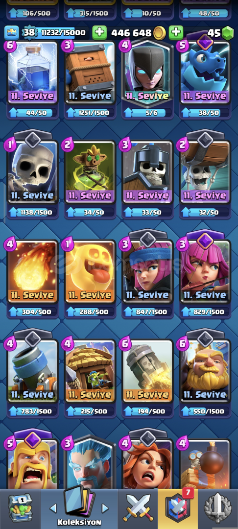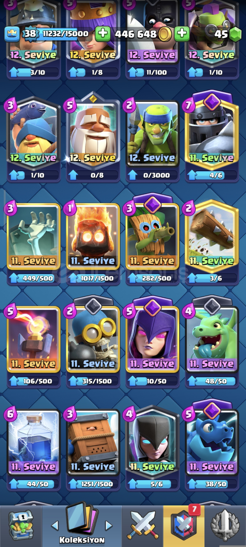 Bütün Efsanevi kartlar vardır.8 adet evo kart bulunmaktadır;1-) Dart Goblini2-) Mega Knight3-) Cadı4-) Elektro Ejderha5-) Büyücü6-) Okçular7-) Barbarlar8-) Tesla(ekstra 2 adet Evrim parçası bulunmaktadır.)Emojileri gerçekten mukemmel bir hesap.Sizin epostaniza bağlanıp teslim edilicek. Ömür boyu garanti sağlamaktayız Güvenilirlik Konusunda hiçbir endişeniz olmasın.