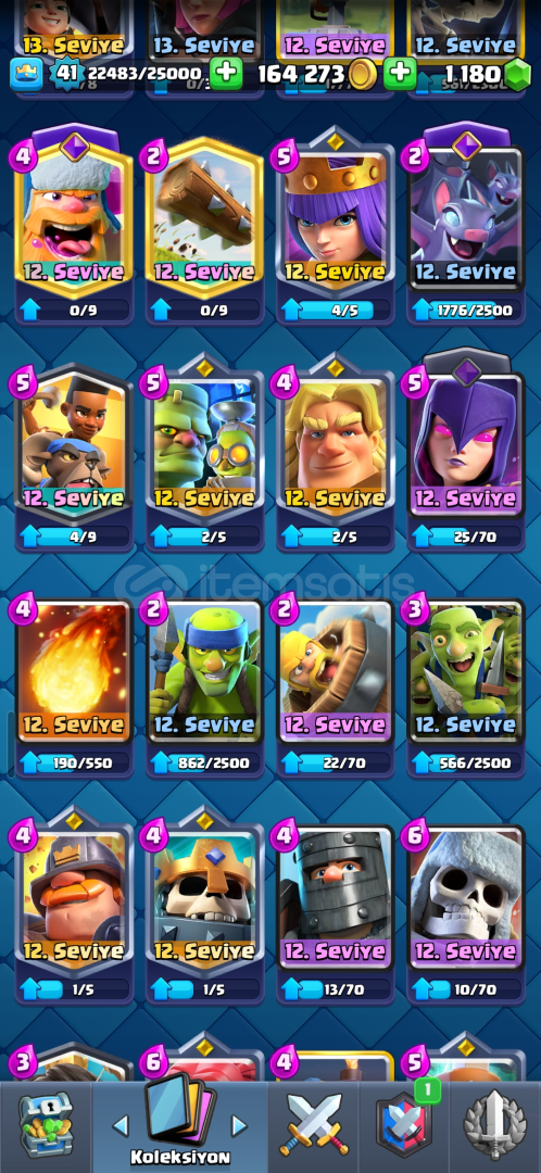 - 7600 kupa- 41 svy- 1100 taş- 6 evrim- 1 Pass Royale açılmıştır (oduncu)- 1 tane 15 svy (pekka)- 1 tane 14 svy- 8 tane 13 svy- 33 ifade- 3 senelik hesap- lav tazısı hariç tüm kartlar bulunur