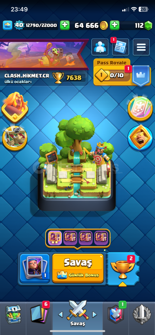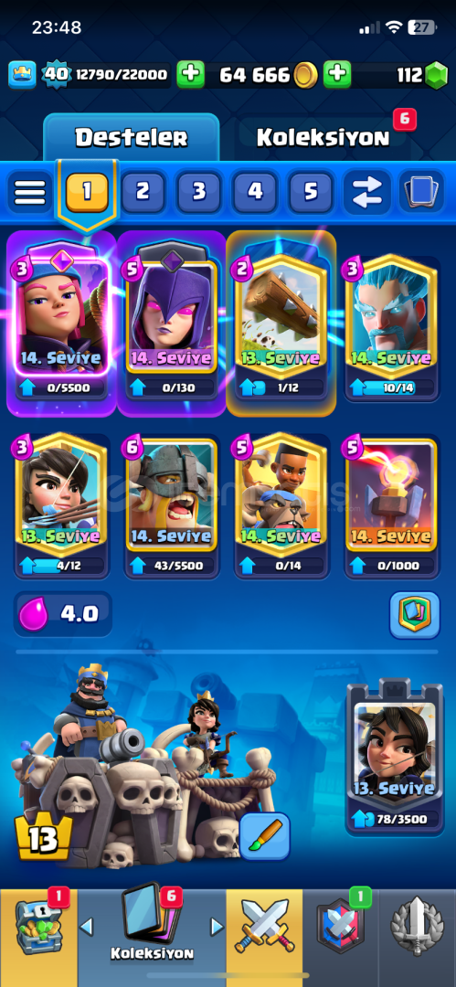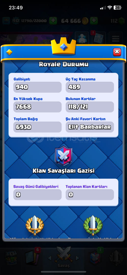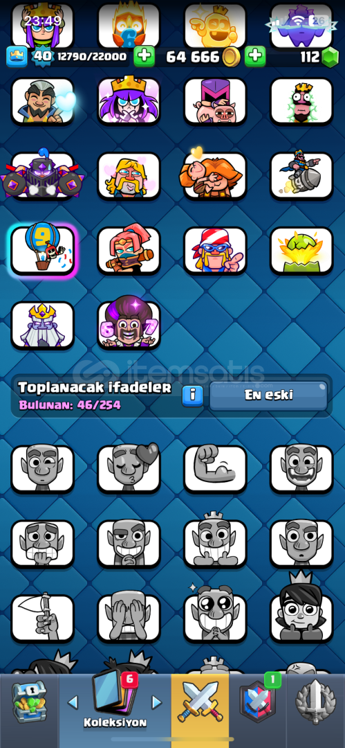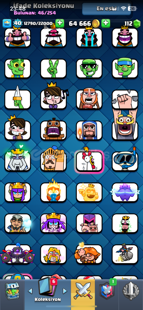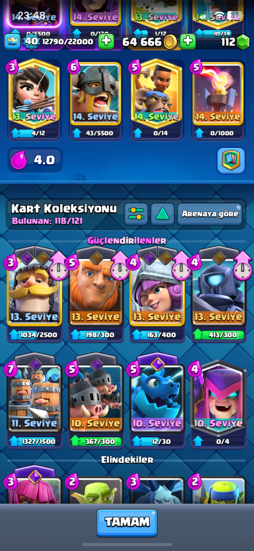 7638 kupa 8 evrim vardır 118 kart 65.000 altın 120 elmas 46 ifada(gece cadısı ifadesi hepsi var) 940 galibiyet,500 3 taç dır Alana hayırlı olsun daha fazla sorusu olursa özelden yazsın ❤️