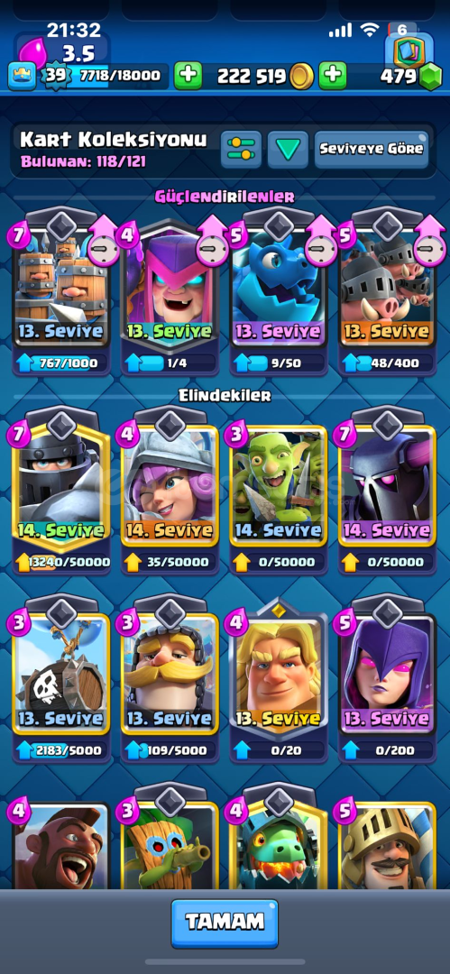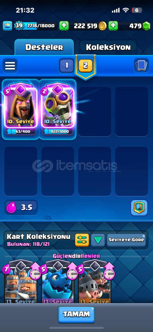 Hesap Bilgileri Şu Şekildedir:Hesap 7700 KupadadırHesapta Toplam 118 Kart VardırHesapta 2 Evrim Vardır Sırasıyla:BüyücüBombacıHesap 39 SeviyedirHesapta Fazlasıyla Toksik Emoji VardırHesap Koruması Yoktur.Pazarlık Usülüne Göre Yapılır.Otomatik Teslimattır Aktif Olmasam Bile Alabilirsiniz.