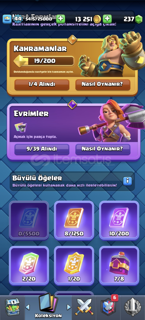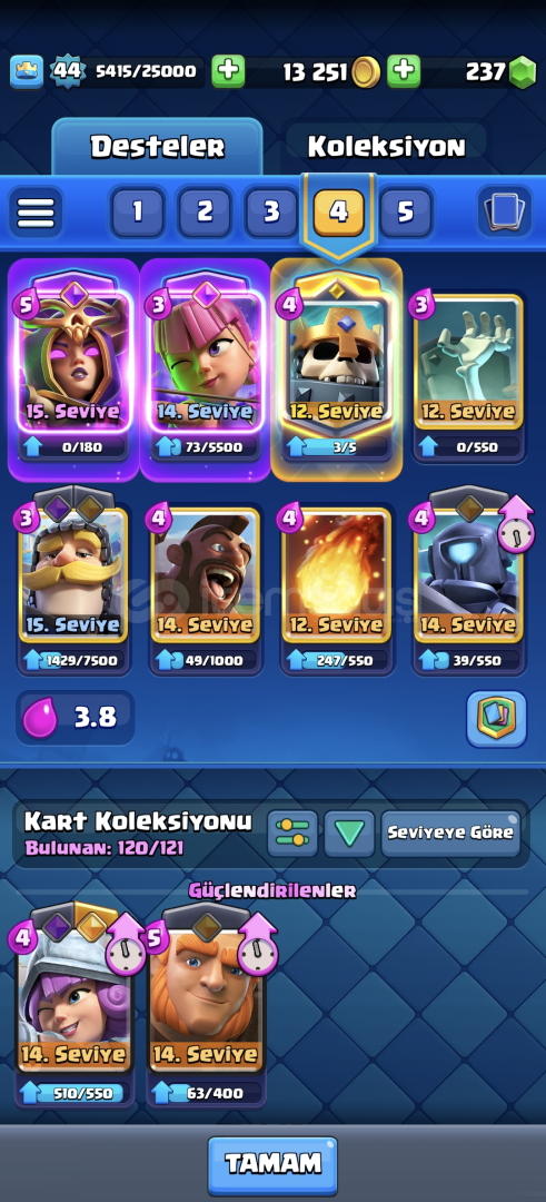 Clash royale44 seviyeİsim değiştirme mevcutYanında 9.seviye bb li coc hesabıSupercell id9 adet evrim1 kahraman