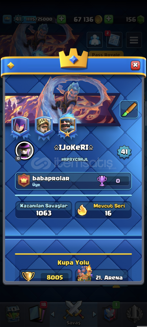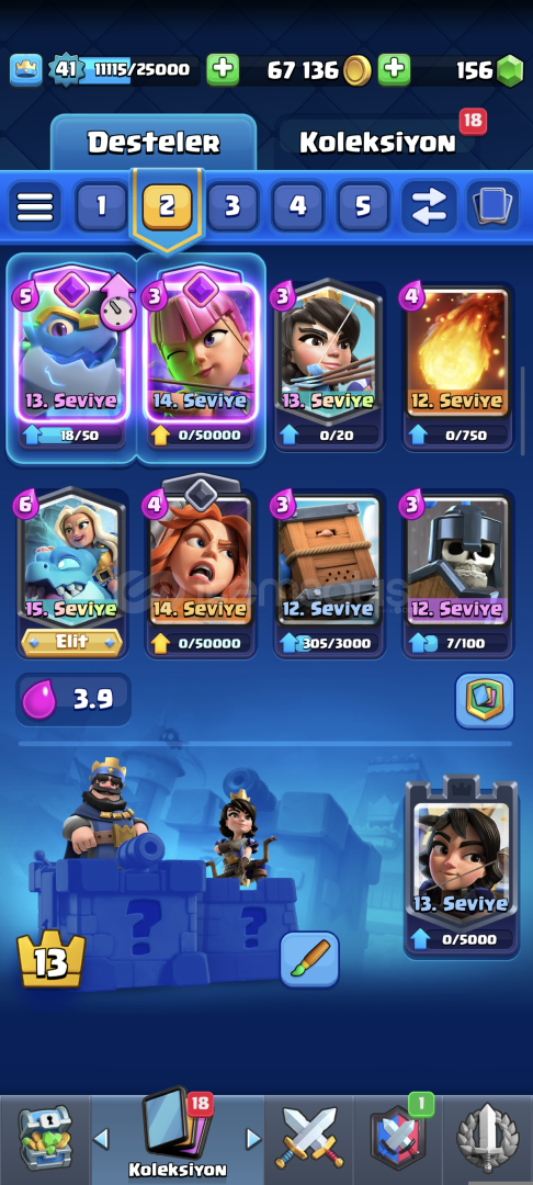 HESAPDA 1100 ELMAS BULUNUR📌 Oyun: Clash Royale📌 Kral Seviyesi: 41📌 Arena: 21. Arena – (8005 Kupa)⭐Arenaya uygun güçlü desteler mevcut.Destelerdeki birçok kart 12–15 seviye arası, çoğu geliştirmeye hazır.Altın: 67.136Hesapda cellatin büyücünün barbarlarin okçuların elektro ejderhanın verimleri vardır oduncuya 1 adet Evrim parçası gerekiyordur 5 a...