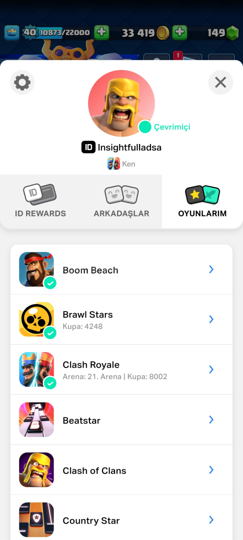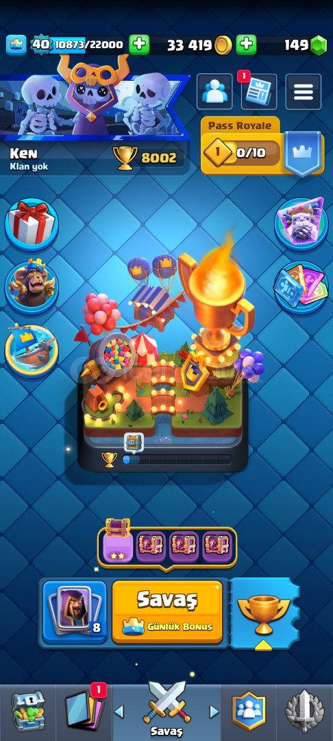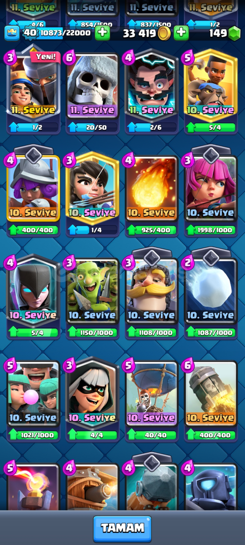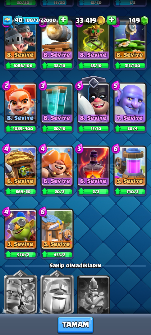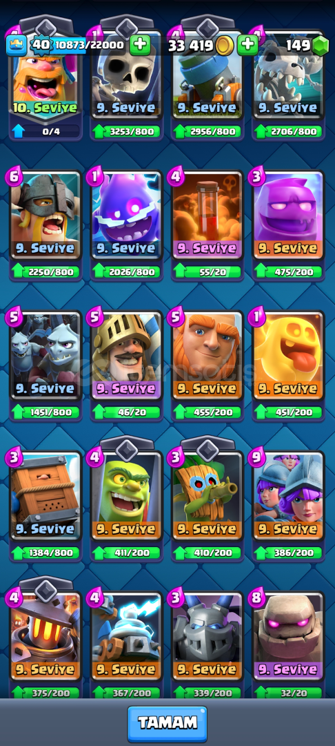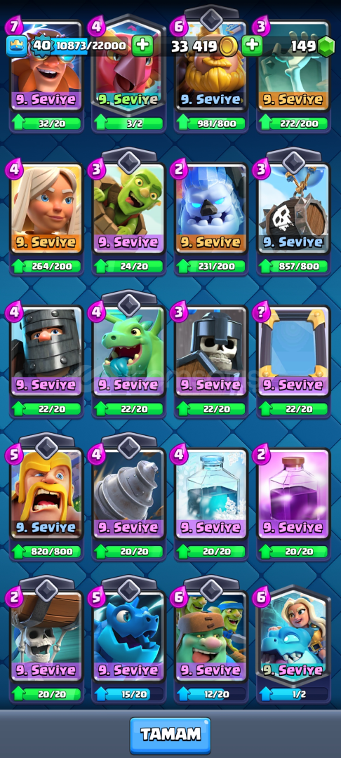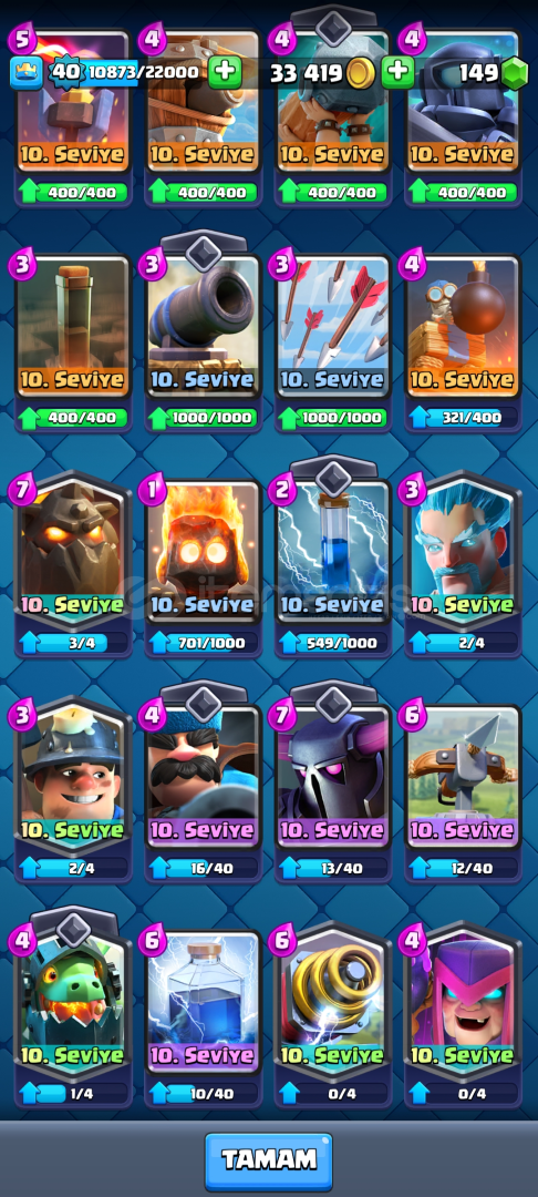 Braw Stars 4248 kupa Clash royale 8002 kupa40 lvlBütün yükseltmeleri yaparsanız en düşük 41 en fazla 46 lvl oluyor4 tam evrimBüyücüValkürTesla Bombacı3 yarım evrimDev kar topu 6/3Oduncu. 6/2Dart goblini. 6/3Burda. Detaylı bakabilirsinizhttps://royaleapi.com/player/R0G9CGLRRTelefon numarası bağlı değil E posta şifre verilecek Normal ederi en az 530 TL dir alıp satarsanız kar ederseniz