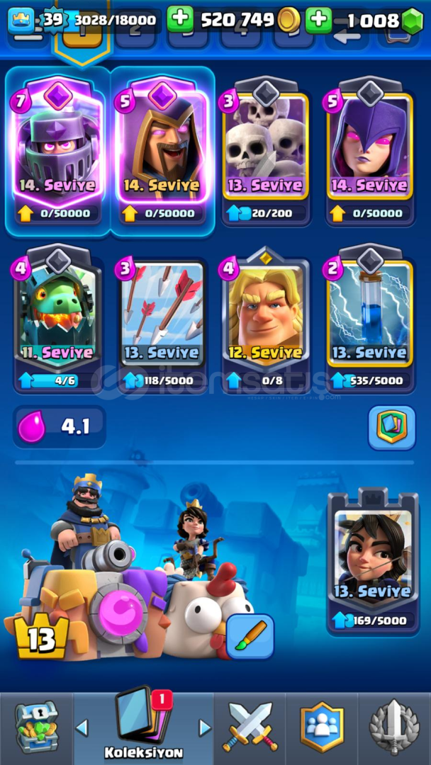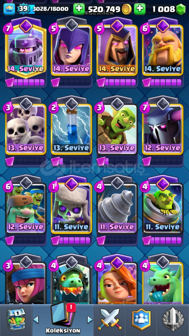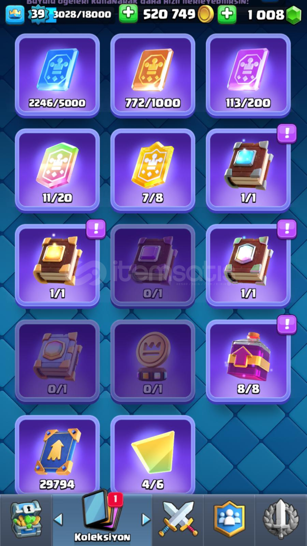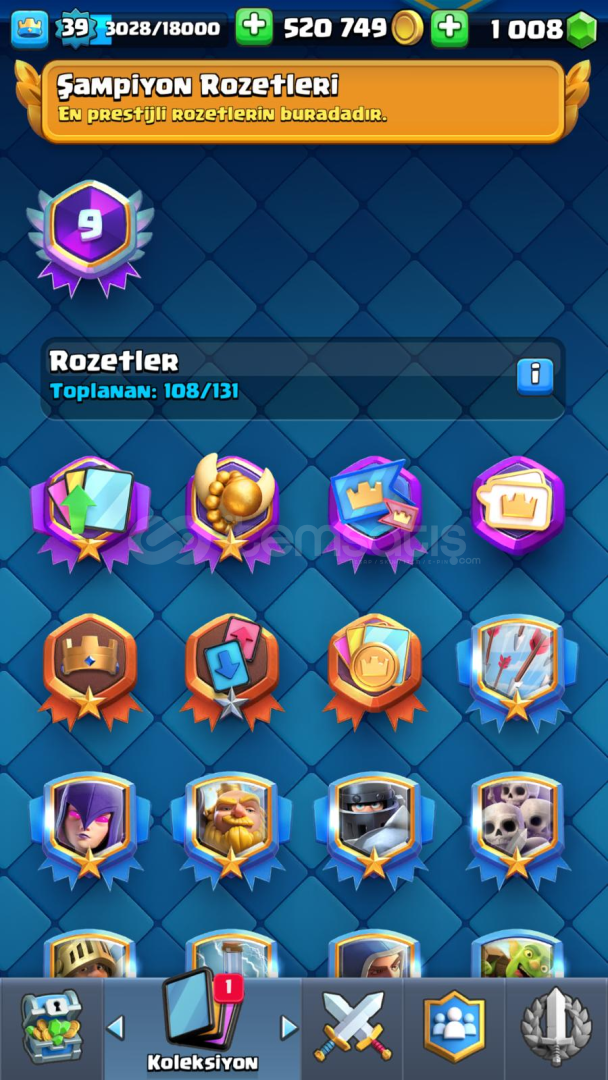 Clash Royale Hesap Özellikleri :🌟| Hesap 39 seviyedir.🌟| Hesapta 1008 elmas 520.000 adet altın bulunmaktadır🌟| Joker kartların nerdeyse hepsi fulle yakındır.🌟| Sıradan, ender ve efsanevi kitabı vardır.🌟| 30.000 elit joker kartı 4 adet ise evrim parçası vardır.🌟| Hesapta 9 yıl oynandır rozeti bulunmaktadır.🌟| Evrimler: Mega Şövalye 6/6...