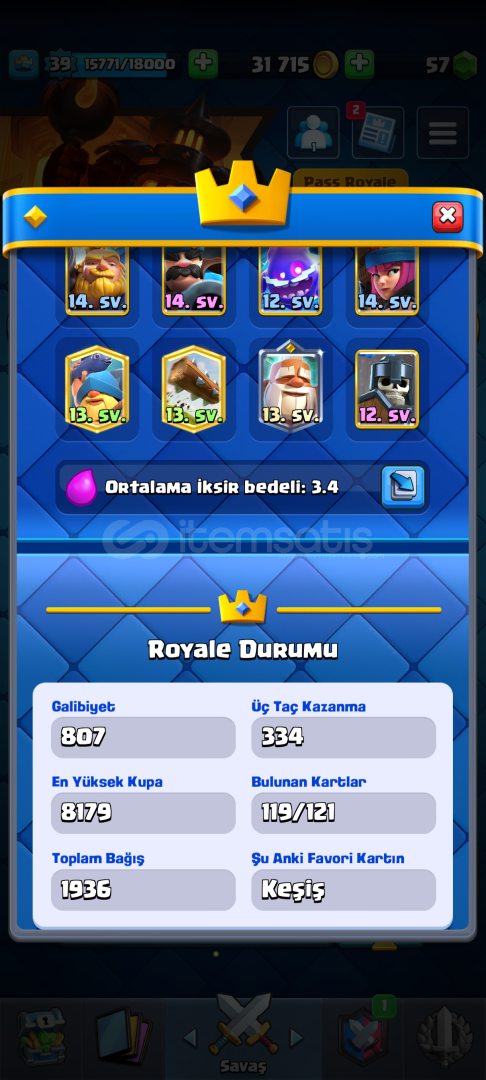 8100 Kupa Max 8250 Civarı Kupaİsim Değiştirme Hakkı varTOPLAM 50 EMOJİ Bolca Toksik mevcutToplam 10 Evrim var Hatta 11 Diyebiliriz Dart Goblini 1 Evrim parçası lazım.Seviyeleri Yüksek Kartlar var.İsim Değiştirme Mevcuttur.Supercell ID üstüne yapılıp teslim edilecektir.