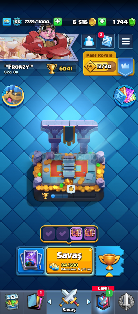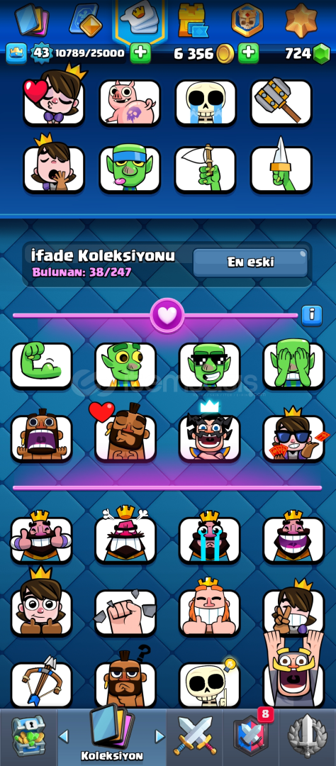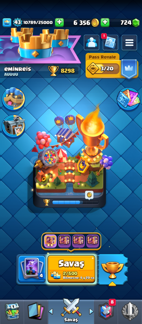 21. Arena 8300 kupa tüm kartlar var 750 elmas 2 maks kart 8 evrim olan bi hesap ve 6000 kupa tüm kartlar açık 5 evrim 1800 ta...
