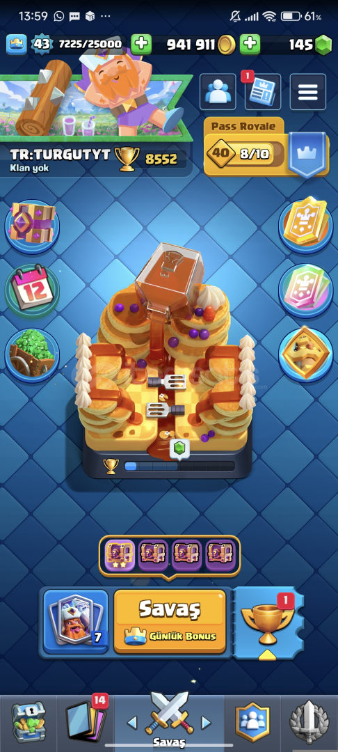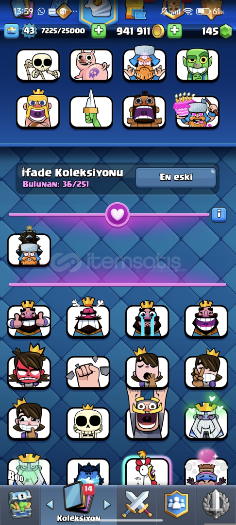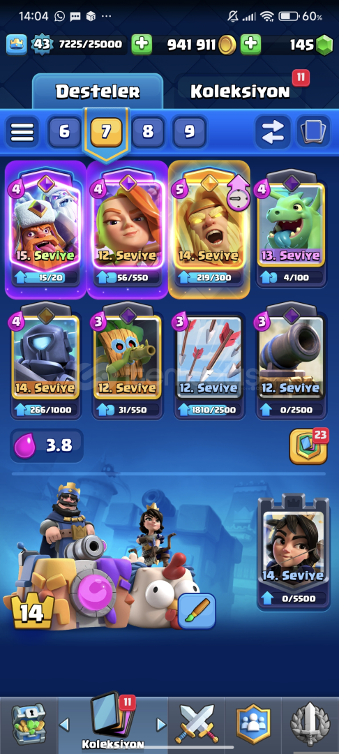 🏆 8.550+ kupa🃏 Bütün kartlar açık🔄 7–8 adet Evrim kart😎 Nadir ve özel emojiler🏰 Kule Seviyesi: 14⭐ Hesap Seviyesi: 43EVRİMLERCehennem Ejderhası 🐉Oduncu 🔥Valkür 💨Fırın 🔥Avcı 😶‍🌫️Barbarlar😡
