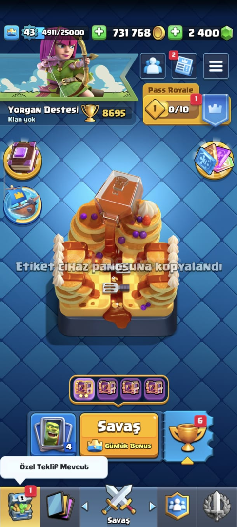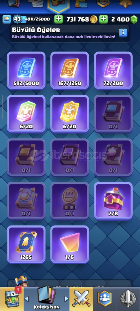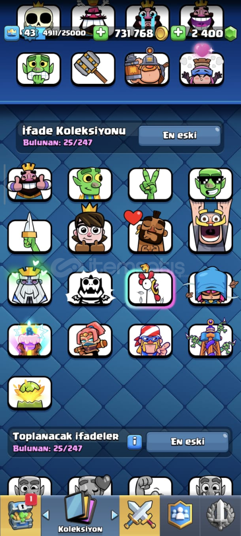 Hesaba detaylıca bakmak için: https://royaleapi.com/player/R0V8RUYHesaplar asla geri çekilmez!Hesap koruması aktif değildir!Yeni güncelleme sebebiyle sezon geçişlerinde CLASH ROYALE HESAPLARINDA kupa kaybı yaşanabiliyor bilginize.Sipariş Sonrasında oluşacak sonular için kalıcı destek!"Neden beni tercih etmelisiniz?"+660 Başarılı işlem.Yüksek müşteri memnuniyeti.Supercell oy...