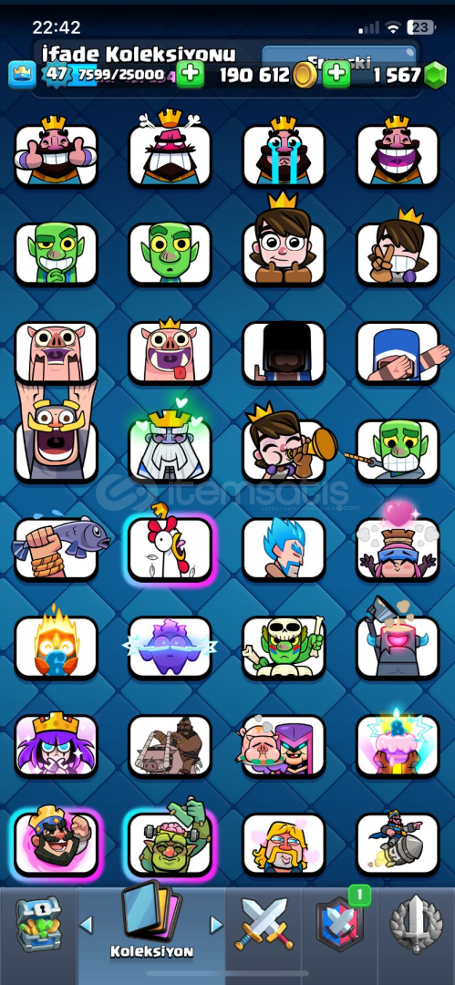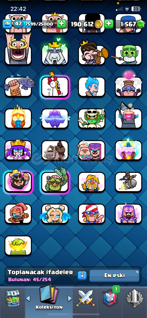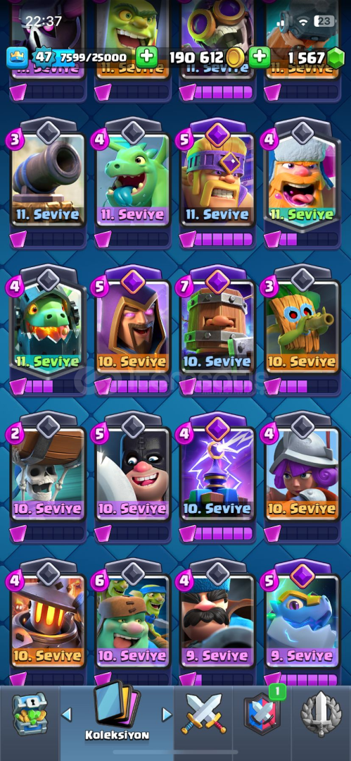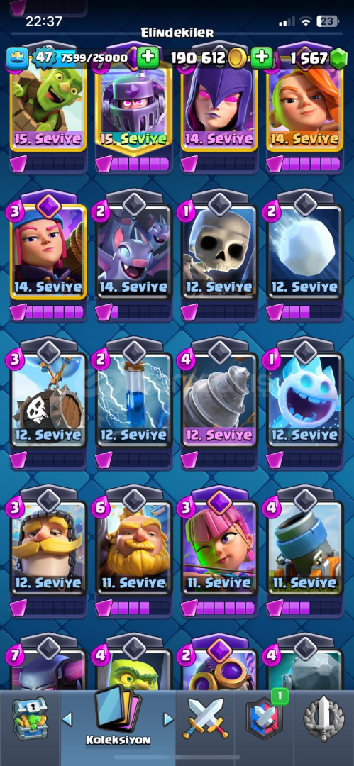 ➤ 8600 KUPA➤ 1567 ADET TAŞ➤ 10 ADET EVRİMLİ KART➤ 3 ADET 15LVL KART (MEGA ŞÖVALYE-GOBLİN FIÇISI-MİNİ PEKKA)➤ 45 ADET FAVORİ EMOJİLER➤ 5 ADET KULE KOSTÜMÜ➤ 45 ADET FLAMA➤ 53 ADET FLAMA ÇERÇEVESİ➤ 40 ADET ROZET➤ SADECE 3 KART EKSİKHER BAKIMDAN DOLU BİR HESAPTIR İSTEYENE DETAYLI FOTOĞRAF ATARIM.