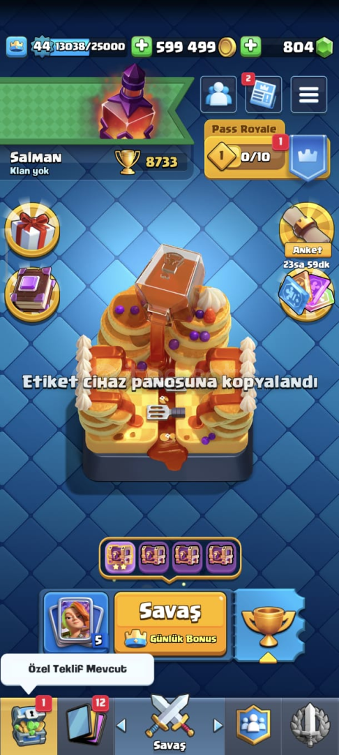 Hesaba detaylıca bakmak için: https://royaleapi.com/player/2YPCLVLCJHesaplar asla geri çekilmez!Hesap koruması aktif değildir!Yeni güncelleme sebebiyle sezon geçişlerinde CLASH ROYALE HESAPLARINDA kupa kaybı yaşanabiliyor bilginize.Sipariş Sonrasında oluşacak sonular için kalıcı destek!"Neden beni tercih etmelisiniz?"+660 Başarılı işlem.Yüksek müşteri memnuniyeti.Supercell ...