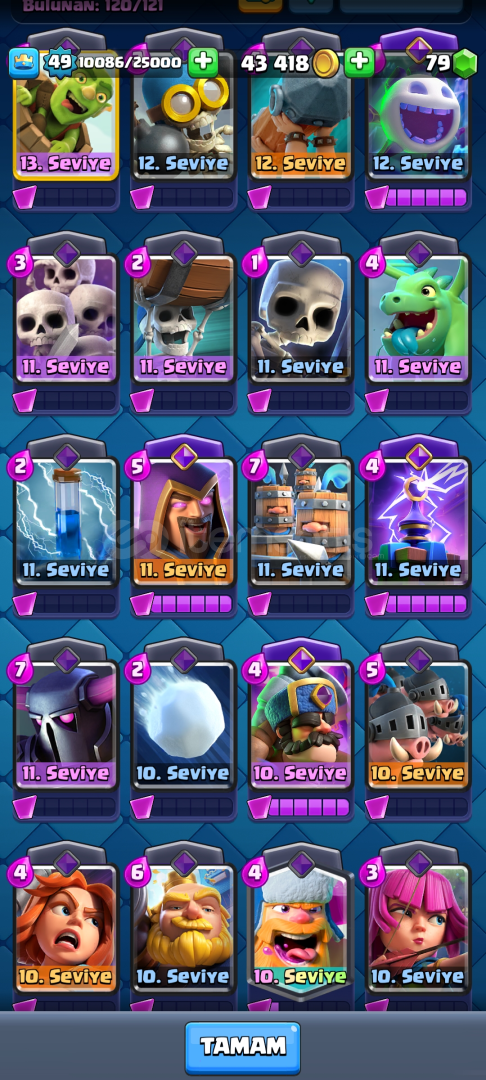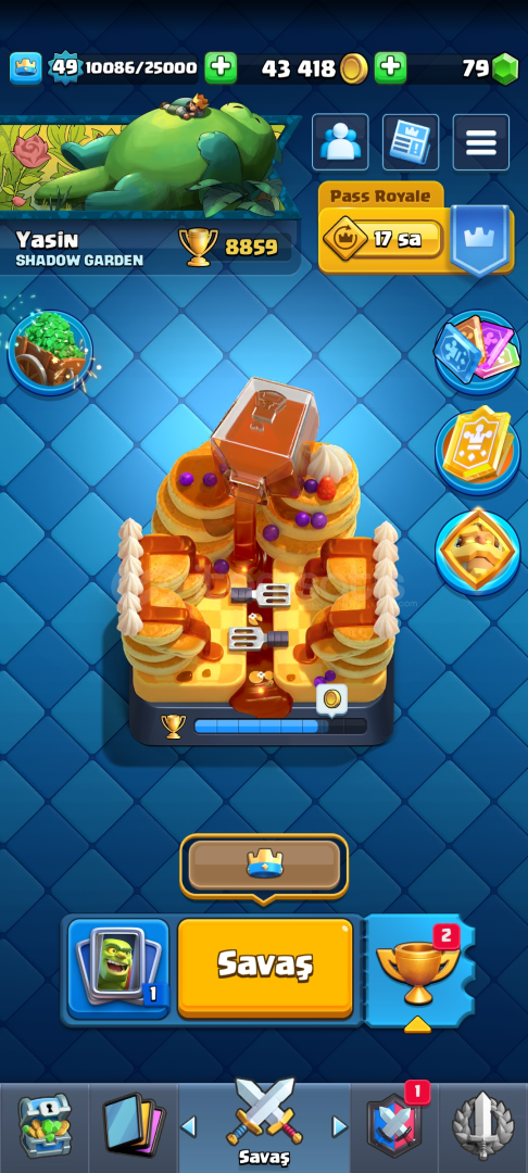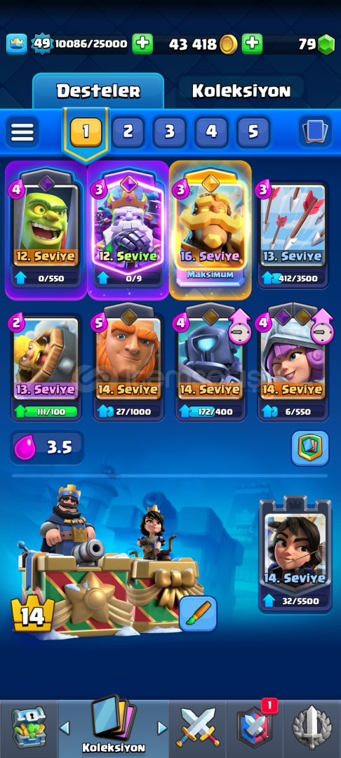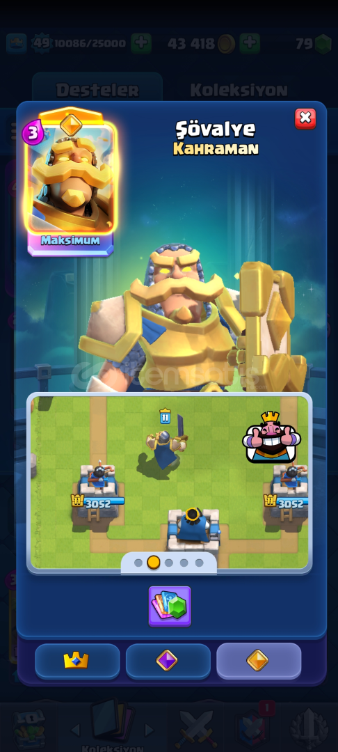 ANA KULE VE YAN KULELER 14 SEVİYEHESAP SEVİYESİ 498500 KUPA KAHRAMAN ŞÖVALYE 16.SEVİYE MAKS32 EMOJİ4 KULE TİPİ