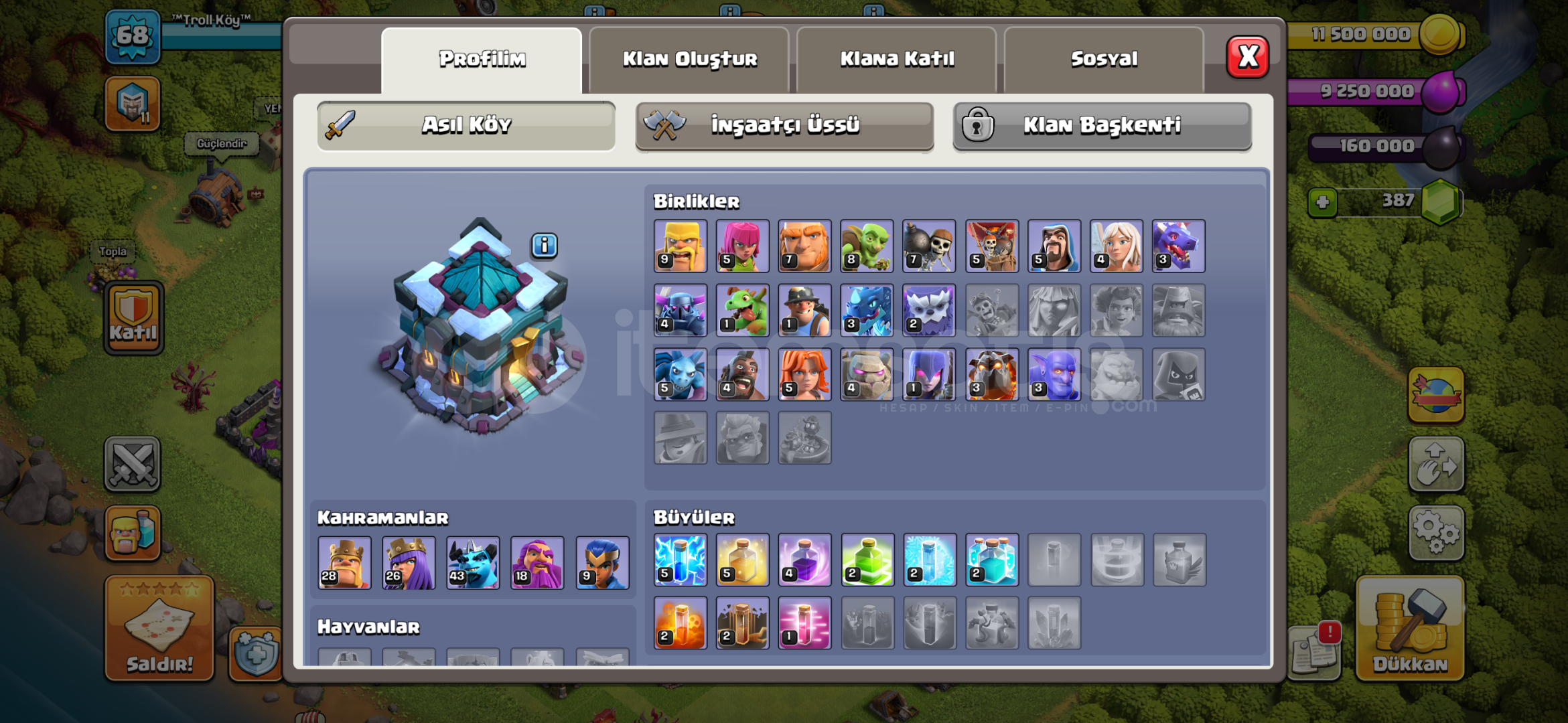 CR HESABI 9 YILLIK 11 EVRİMİ VAR1 TANE ELİT, 8 TANE 14 SV, 16 TANE 13 SV, 46 TANE 12 SVBS HESABI 36K 42 DESTANSI SKİN 69 SÜPER ENDER SKİN 55 ENDER SKİNBB13 COCPAZARLIK SÜNNETTİRALICISINA HAYIRLI OLSUN