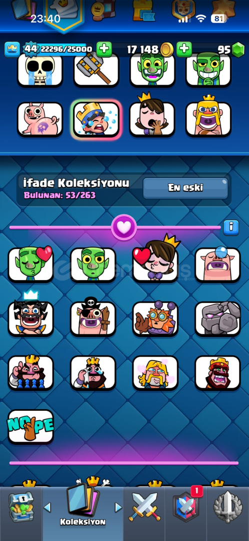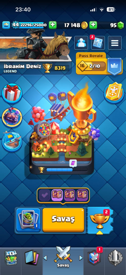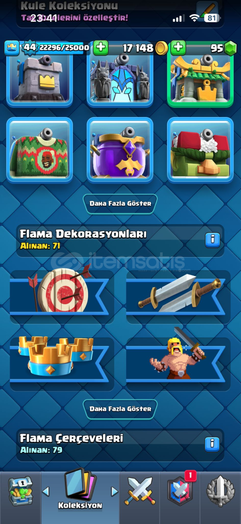 8313 Kupa44 Seviye53 ifade var Tokmak emojisi ve bir sürü toxic emoji5 Kule görünümü71 Flama Dekorasyonu 79 Flama Çerçevesi (150)6 Yıllık hesapEvrimler-Barbarlar-Bombacı-Büyücü-Havan-Valkür-Şövalye -Mega Şövalye 4 parça