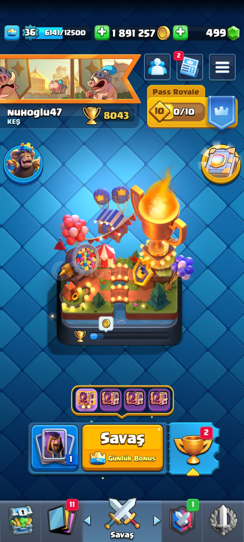 8k kupa 6 yıllık 1.8m altın 500 elmas var onun dışında 5 Evrim var 36 seviye birçok kule deseni mevcut çok nadir emojiler(hypnos çekiç,ağlayan iskelet gibi) küçük bir klanı var hesabın onun dışında 120 kart var Kendi şahsi hesabımdır