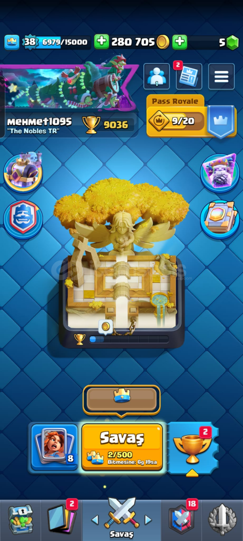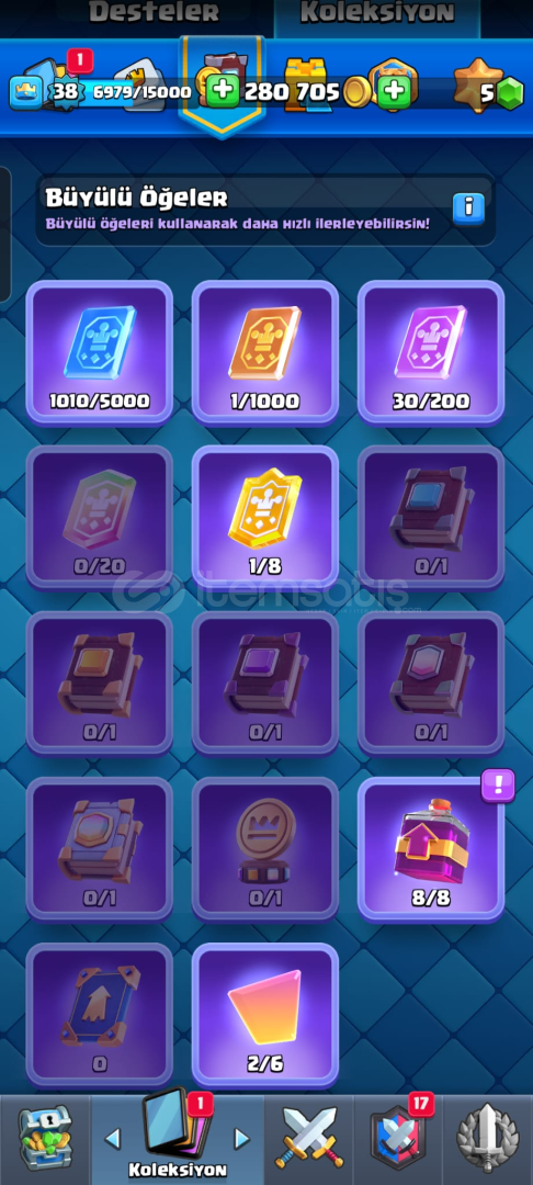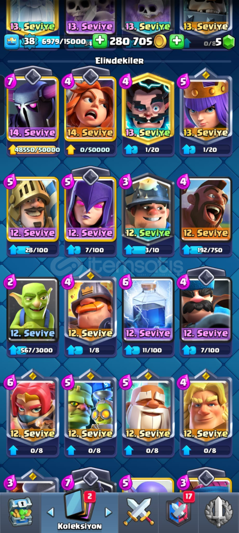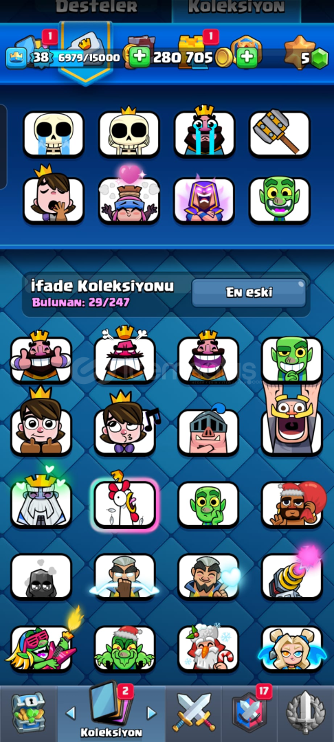 HESAP 38 SEVİYE9036 KUPA280K ALTIN - 5 TAŞBÜTÜN KARTLAR AÇIKTIROKÇU , TESLA , ELEKTRO EJDER , BARBARLAR VE BÜYÜCÜ EVRİMİ AÇIK1 ADET CELLAT , PEKKA , VALKÜR ; 2 ADET CADI VE AVCIDA EVRİM PARÇACIĞI MEVCUTPEKKANIN 15 SEVİYE OLMASINA SADECE 1500 ELİT JOKER KART KALMIŞTIR29 EMOJİ (TOKMAK , GÜLEN GOBLİN GİBİ TOXİC EMOJİLER MEVCUT)1010 SIRADAN , 1 ENDER , 30 DESTANSI...