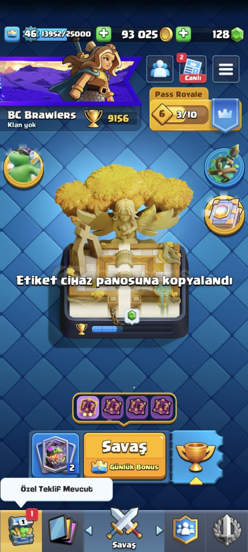 Otomatik teslimattır aktif olmasamda alabilirsiniz!Eposta:şifre formatında ve hesabı nasıl üzerinize alacağınızın hakkında bütün bilgiler satın alınca otomatik iletilecek!Hesaba detaylıca bakmak için:https://royaleapi.com/player/VQ92UJRHesaplar asla geri çekilmez!Hesap koruması aktif değildir!Yeni güncelleme sebebiyle sezon geçişlerinde CLASH ROYALE HESAPLARINDA kupa kaybı...