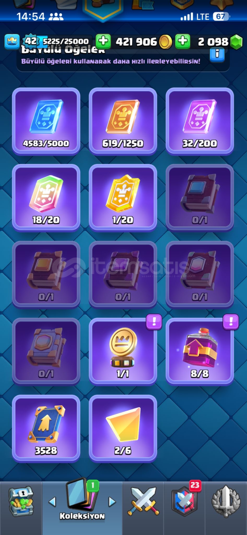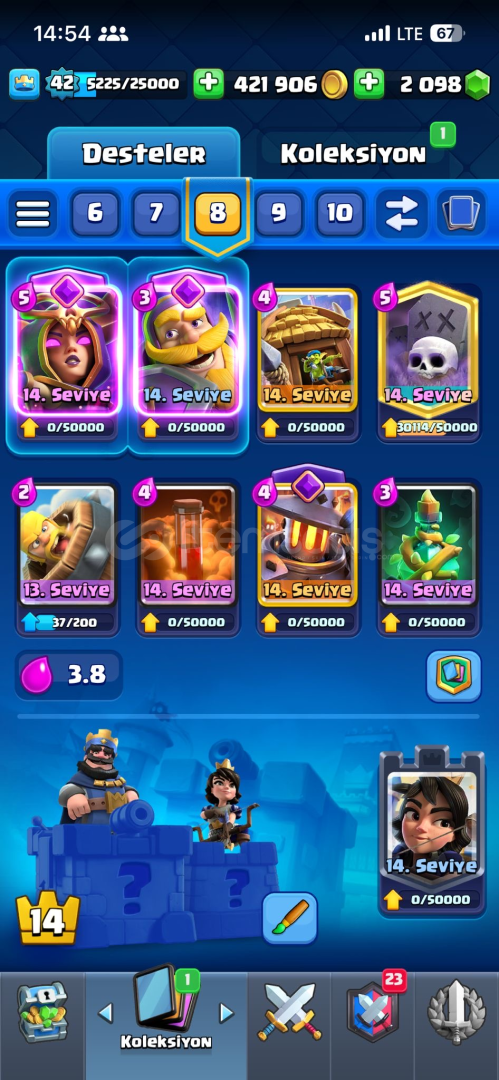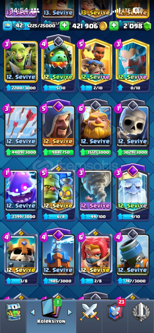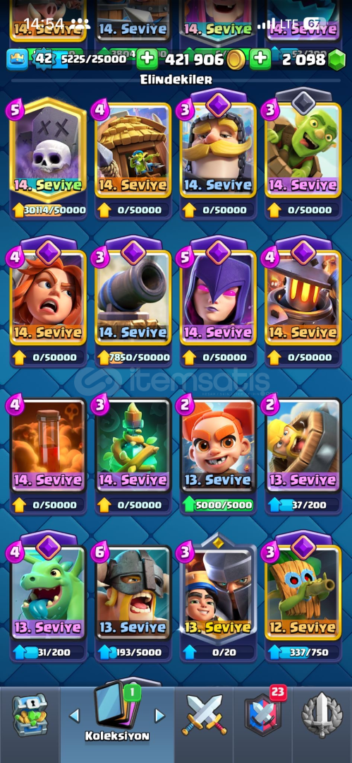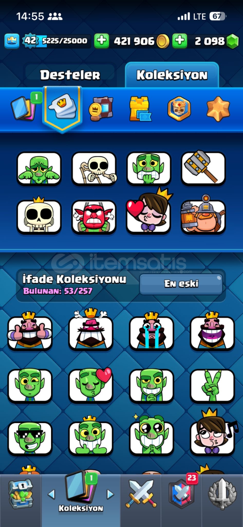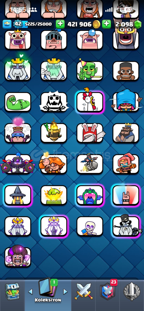 17evrim11 14level kartmezarlık destesi full kule prensesi 1460emoji tokmak ve birsürü toxic emojitüm kartlar mevcut 5 kule görünümü42kral seviyesi2000tas mevcutPAZARLIK PAYI COKTUR