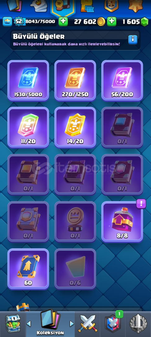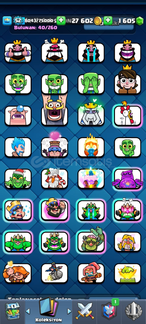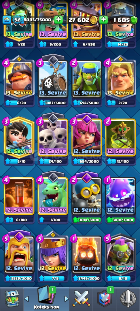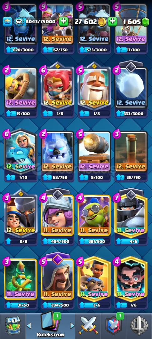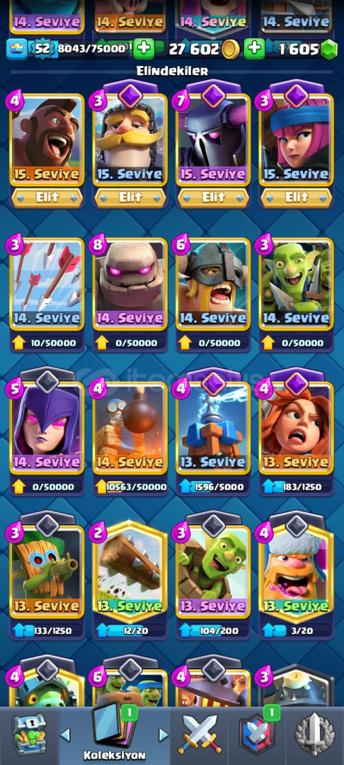 Hesapta herşey var 9350 kupa hesap 4 tane elit ve 11 tane evrim vardır. Normalde 10 tane fakat cadının açılmasına 1 parça kaldı o yüzden 11 tane diyorum. Öğrenciyim ve maddi sıkıntılar çekiyorum o sebepten acil satılık. Hesapta 1605 taş vardır. İsteyen ismini de değişebilir. Hesaptaki tüm karakterler açıktır en düşük seviye 10. ACİL PARAYA İHTİYACIM VAR O YÜZDEN SATIYORUM.