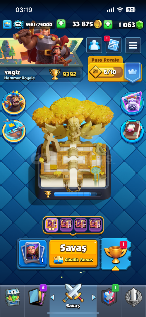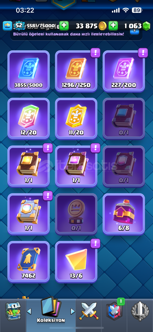 Hesap 9400 kupa fakat joker kartlar falan gayet var 13 tane evrım parçası var ve 14 tane evrim açık 4 tane de 15 seviye elit kart var hesapda sadece okcu kralıce yok