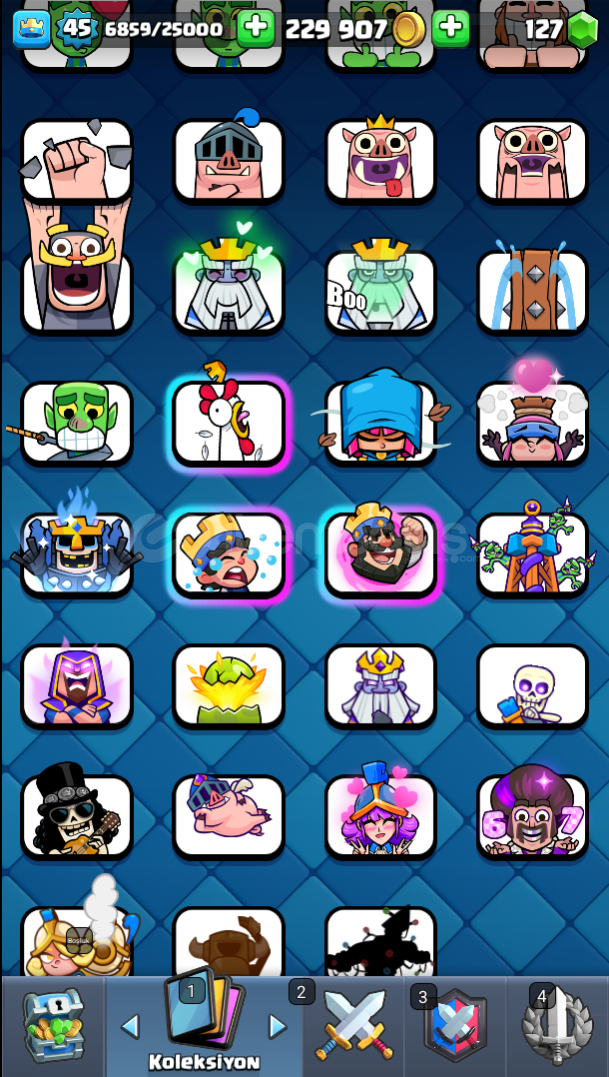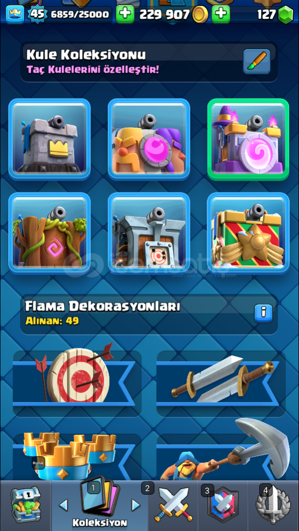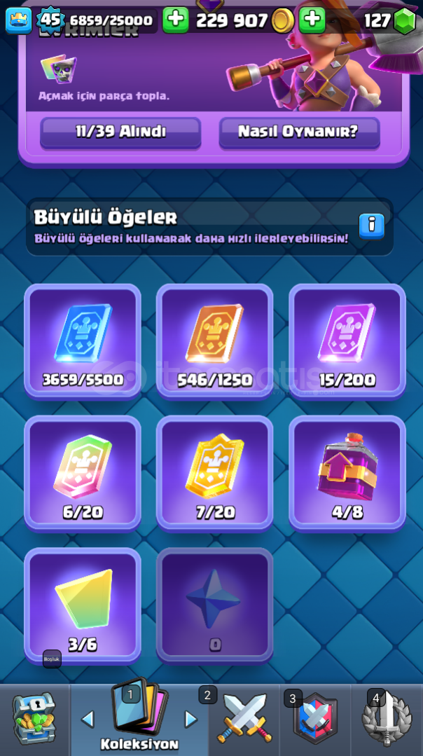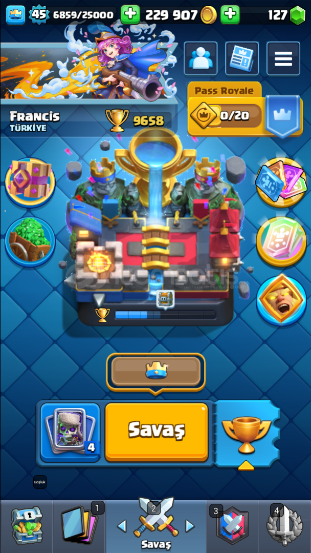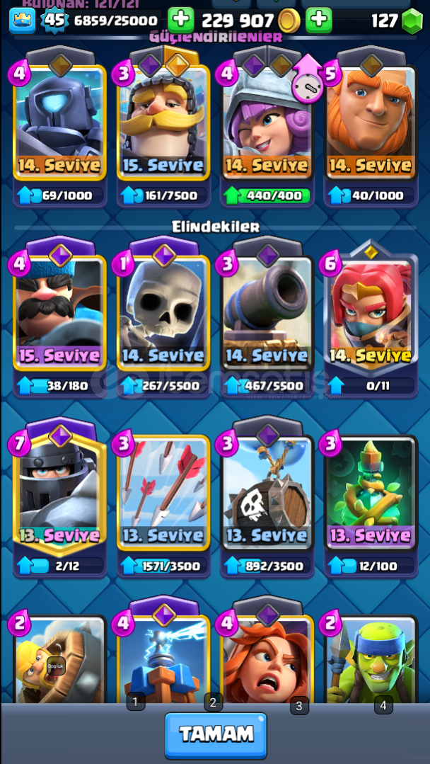 60 ifade6 kule görünümü3 joker parçatüm kartlar açık full hesapevrimler: mega şövalye, iskeletler, bombacı, buz ruhu, fırın, avcı, cadı, electro ejder, büyücü, okçu,tesla, barbarlar, 2 silahşör, 3 isketelet fıçısı, 3 cellat, 3 cehennem ejderhası, 3 dart goblini, 2 kraliyet hayaleti parçasıhesap koruması kapalıdır