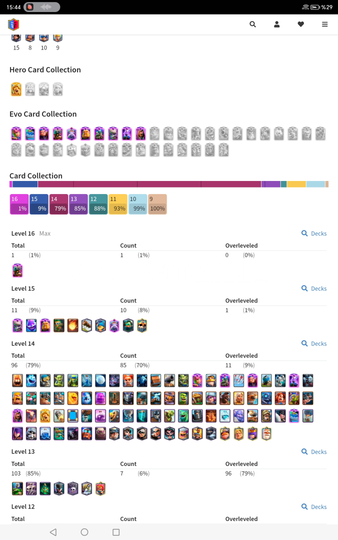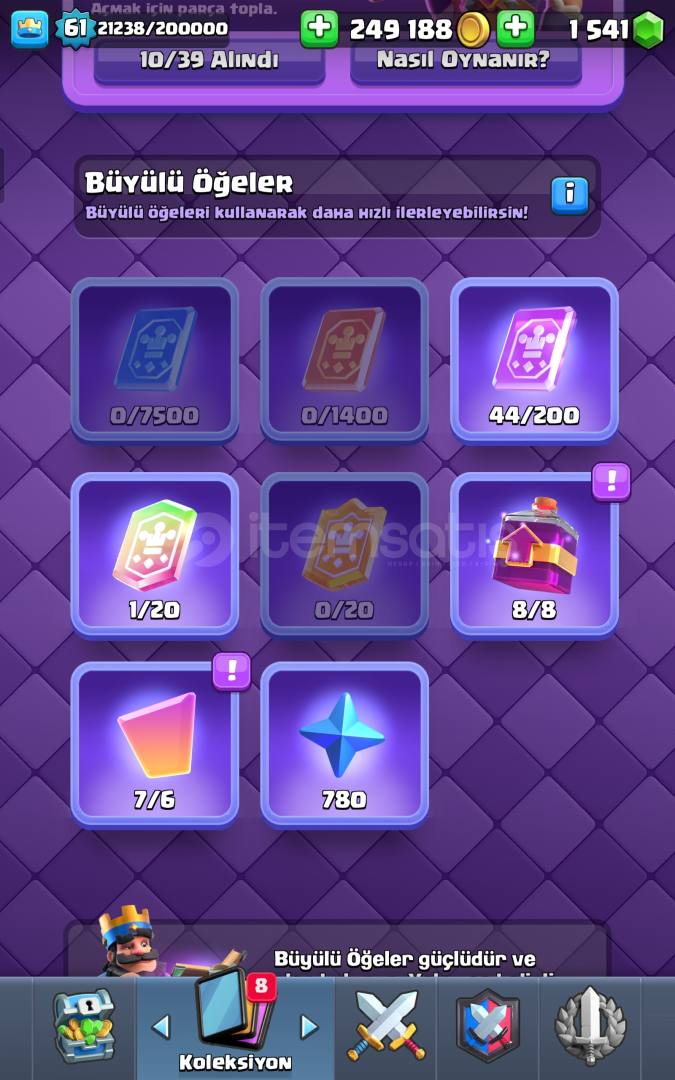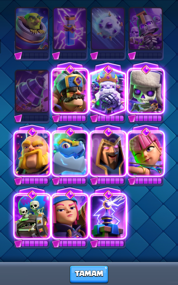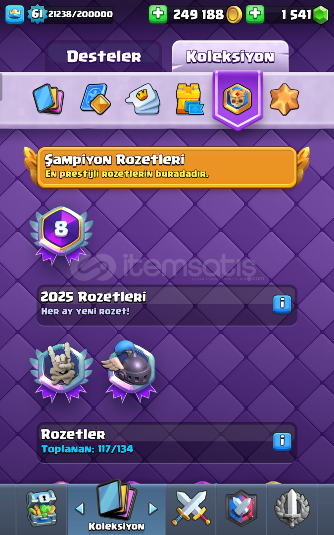 🔹 Arena rozetleri, sezon kupaları ve tam gelişmiş kart koleksiyonu ile tam bir Vitrin Hesabı.