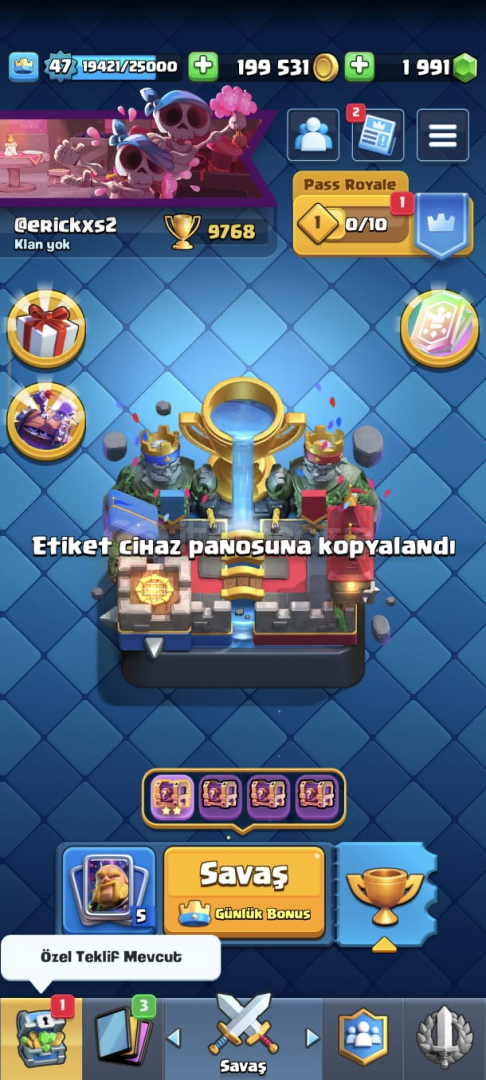 Hesaba detaylıca bakmak için: https://royaleapi.com/player/QGRYCQPRHesap koruması güvenliği bilgileri:🔐Hesap koruması aktif değildir.🔐E-posta değişimini 15 gün içerisinde sorunsuz şekilde gerçekleştirebilirsiniz.🔐E-posta değişimi için gereken sürede hesap mail bilgileri tamamen size aktarılacak size ait olacaktır.🔐Hesaplar sadece size ait olacaktır....