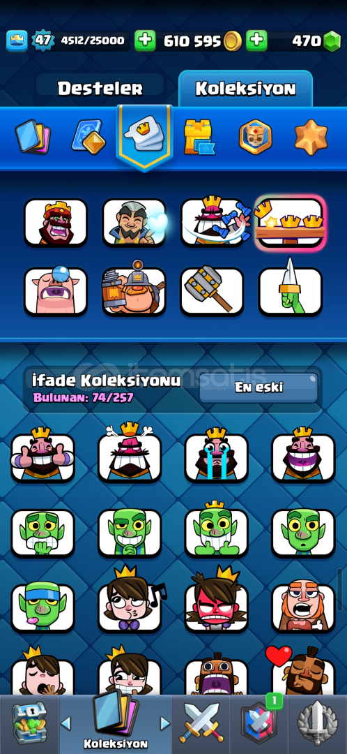 CLASH ROYALE 9700 kupalı 47 seviyeli büyülü öğeleri bol çoğunluk 14-13 seviye kartlar 75+ emoji özel kule görünümleri royal pass alınmış 600k altın 500 elmaslı hesap 850 tl kesinlikle güvenilir pazarlık yapılır alana h.o :)