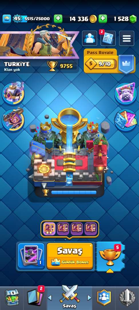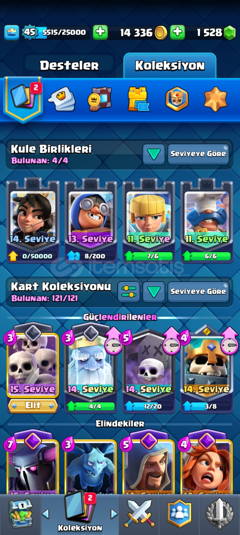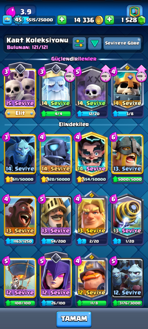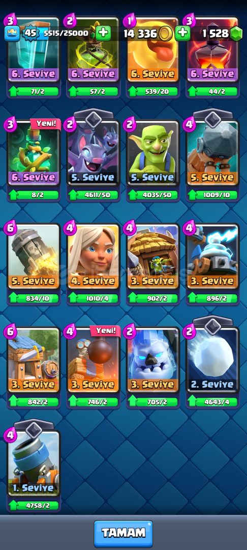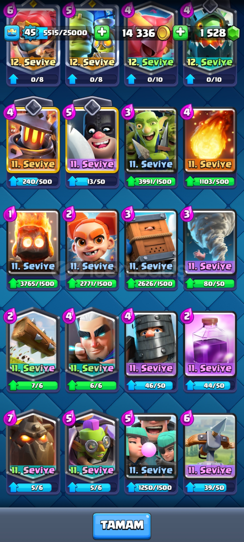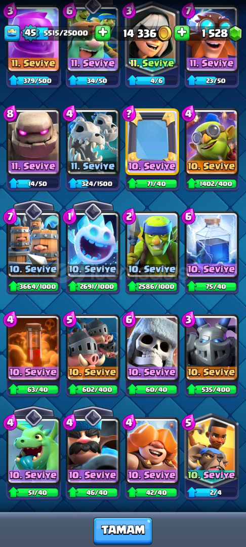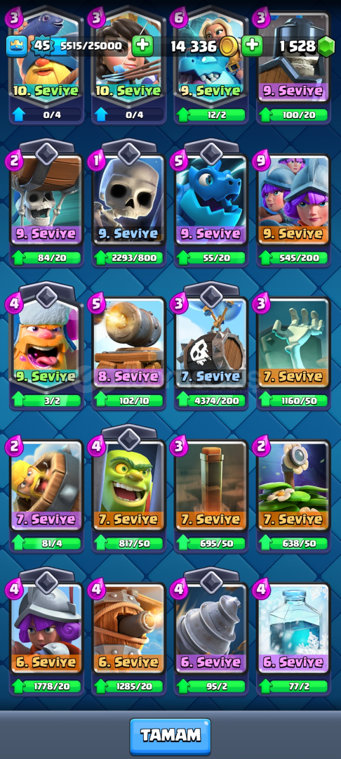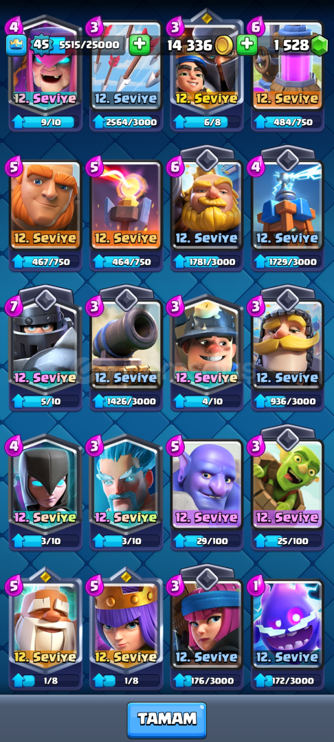 Burdan detaylı bakabilirsinizhttps://royaleapi.com/player/R0V2P9Q9C9755 kupa45 lvlBütün yükseltmeleri yaparsanız 46-51 arası oluyor1528 elma8 tam evrimPekkaValkürBüyücüBombacıÇarpma BarbarlarOkçularDart goblini4 yarım evrim Cellat. 6/2Avcı. 6/1Oduncu. 6/4Dev kar topu. 6/42 elit5 tane 14Telefon numarası bağlı değil E posta şifre verilecek