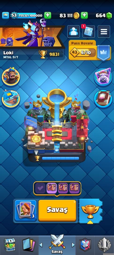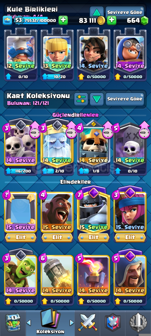 Tüm kartlar açık 85 emoji var 150yi geçkin flama ve arka plan var Tüm kartlar en az 11 seviye evo kart 6-7 tane var kral seviyesi 53 kule seviyesi 54'te 15 seviye olacak.