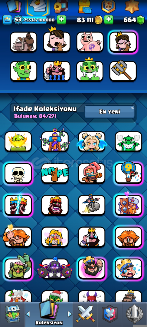 Tüm kartlar açık 85 emoji var 150yi geçkin flama ve arka plan var Tüm kartlar en az 11 seviye evo kart 6-7 tane var kral ...
