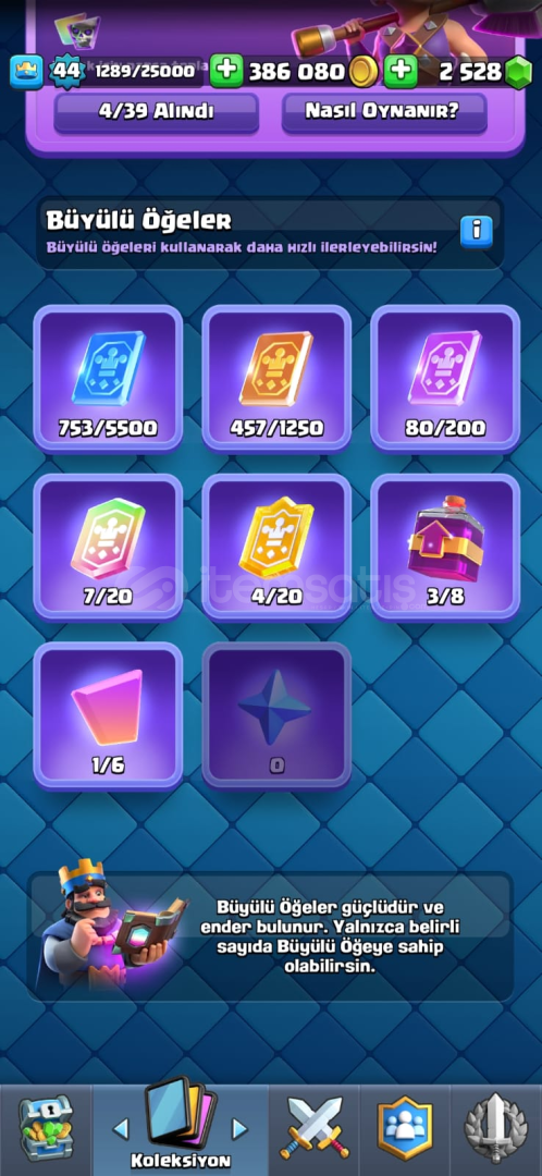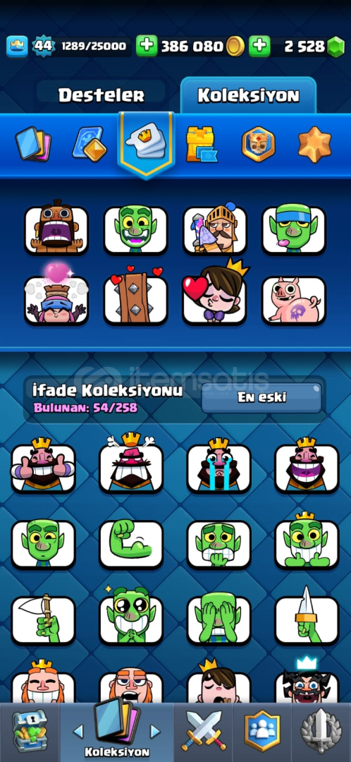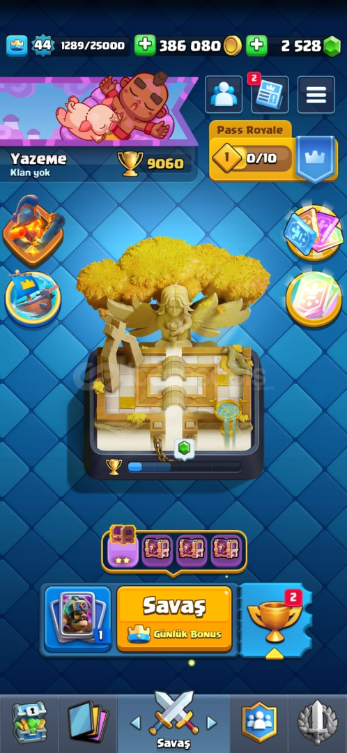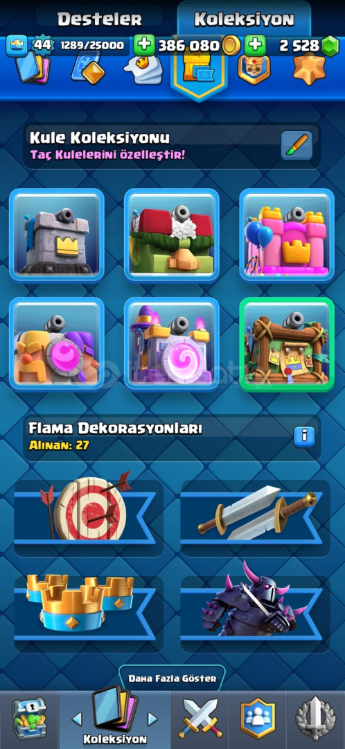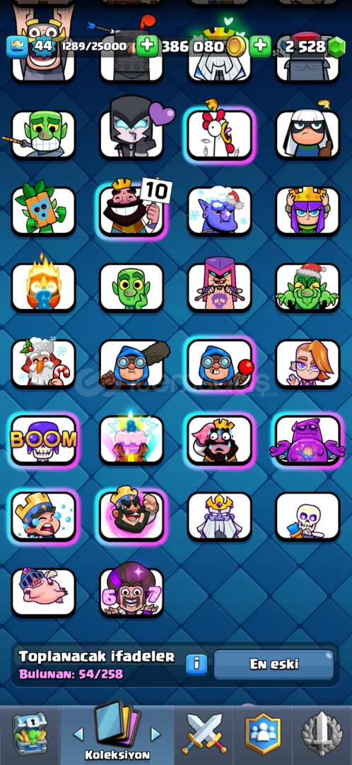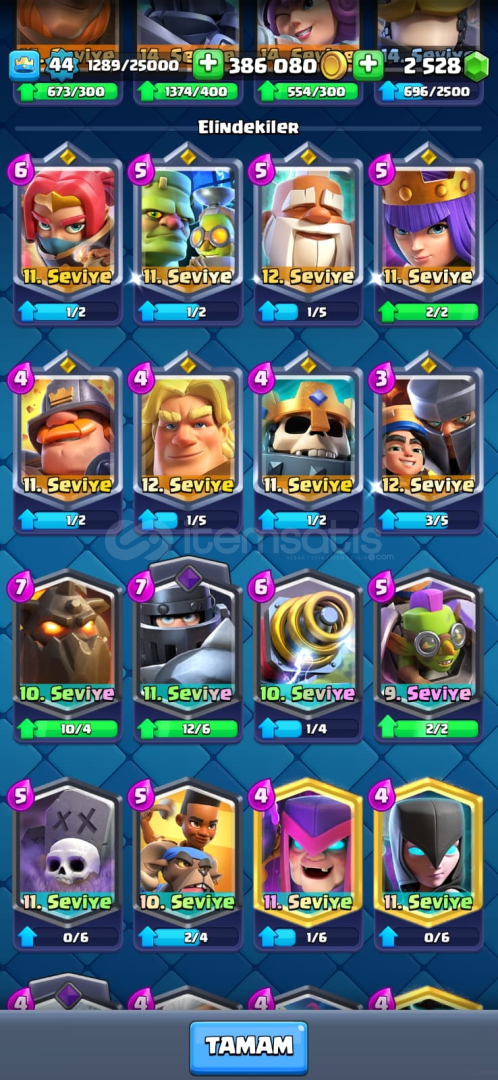 Hesapta;Taş: 2528Altın: 385K+4 Evrim;-Avcı-Fişekçi-Valkür-HavanTüm Şampiyonlar ve Kartlar açık (1 kart açık değil)98 adet emoji!5 Kule kostümü!