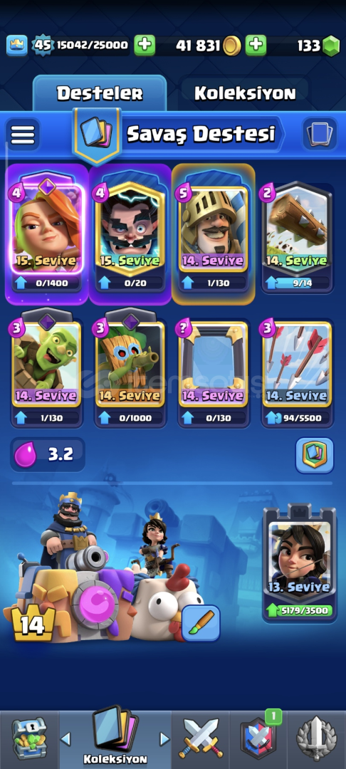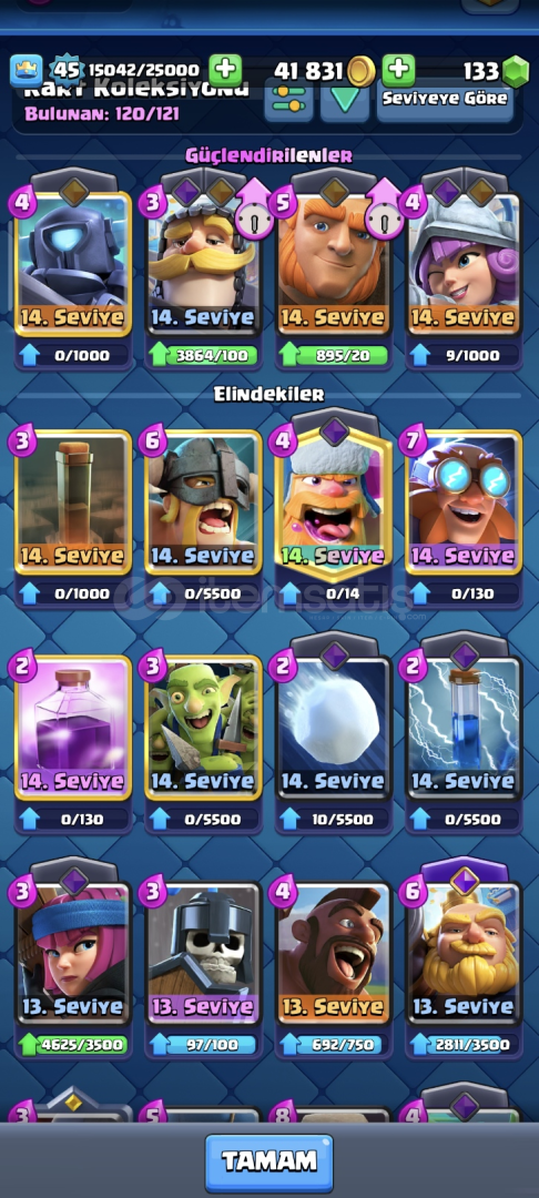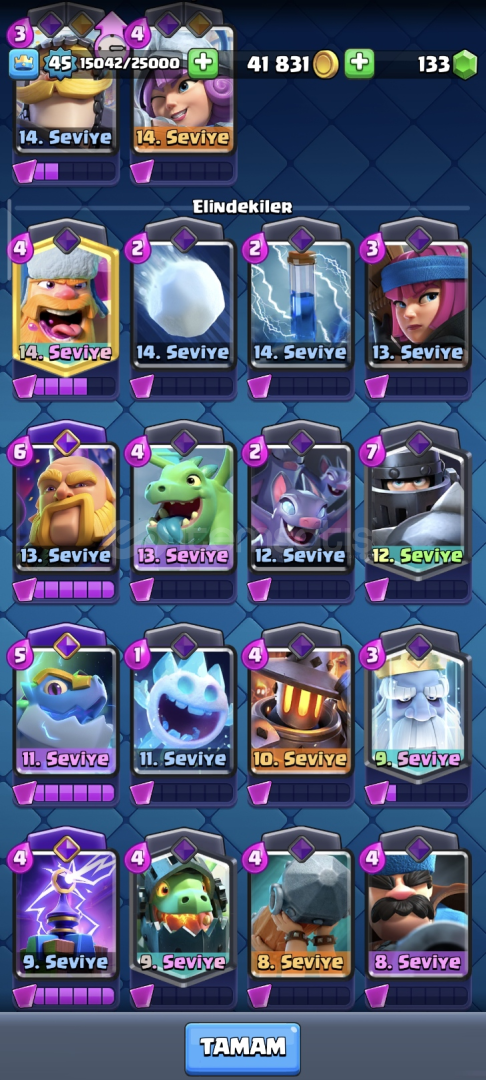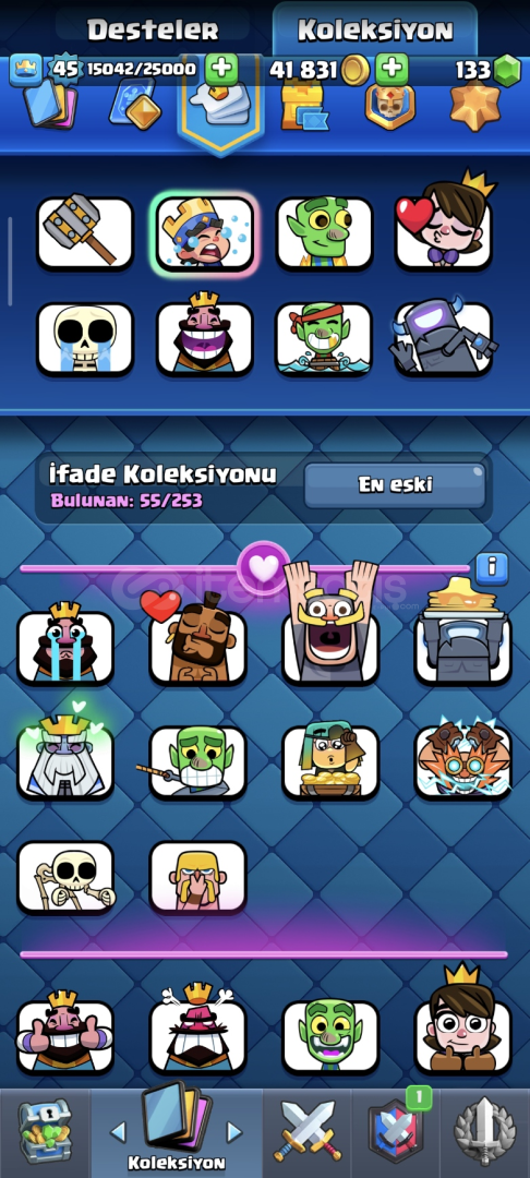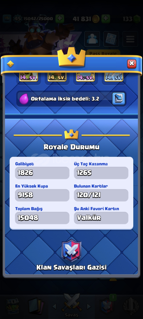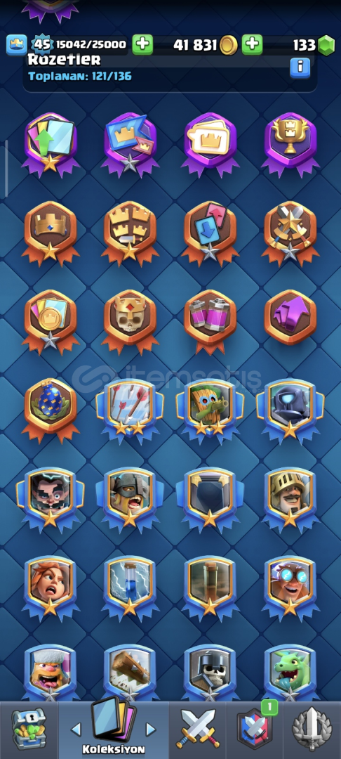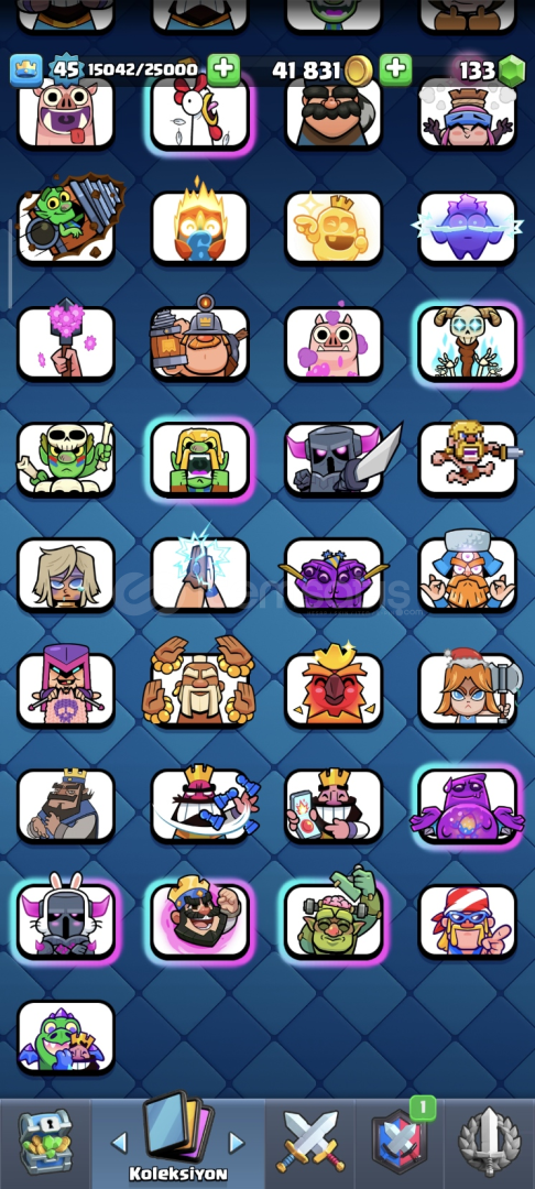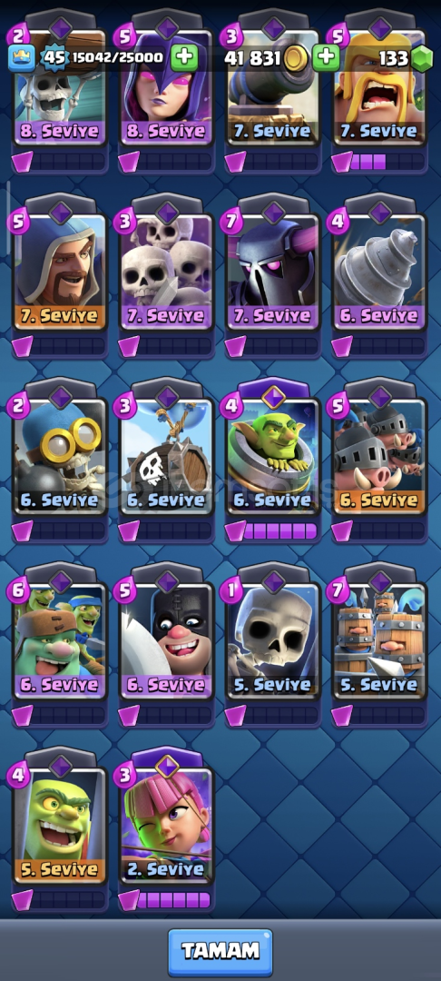 9000 kupalı 5 evrimli 121 rozetli 51 ifadeli henüz kahramanı açılmamış 2 adet 15 lvl kartlı 45 lvl hesap