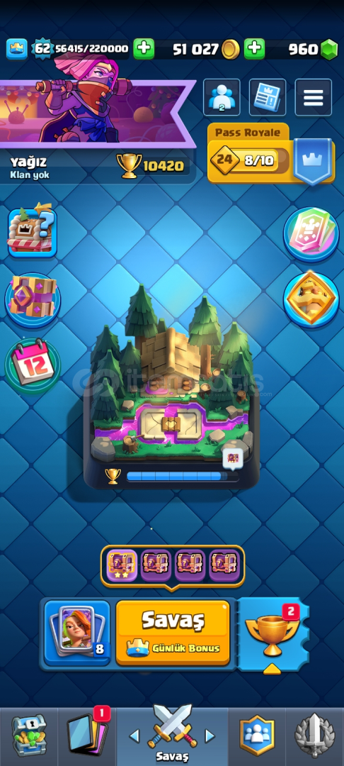 Hesap 10.4k kupa960 taş77 emoji85 arka plan ve flama51k altın4 tane 16 level ksrt6 tane 15 level kart17 adet evrimİsim değistirme hakkı ücretsizdir10 adet kule görünümüne sahiptir