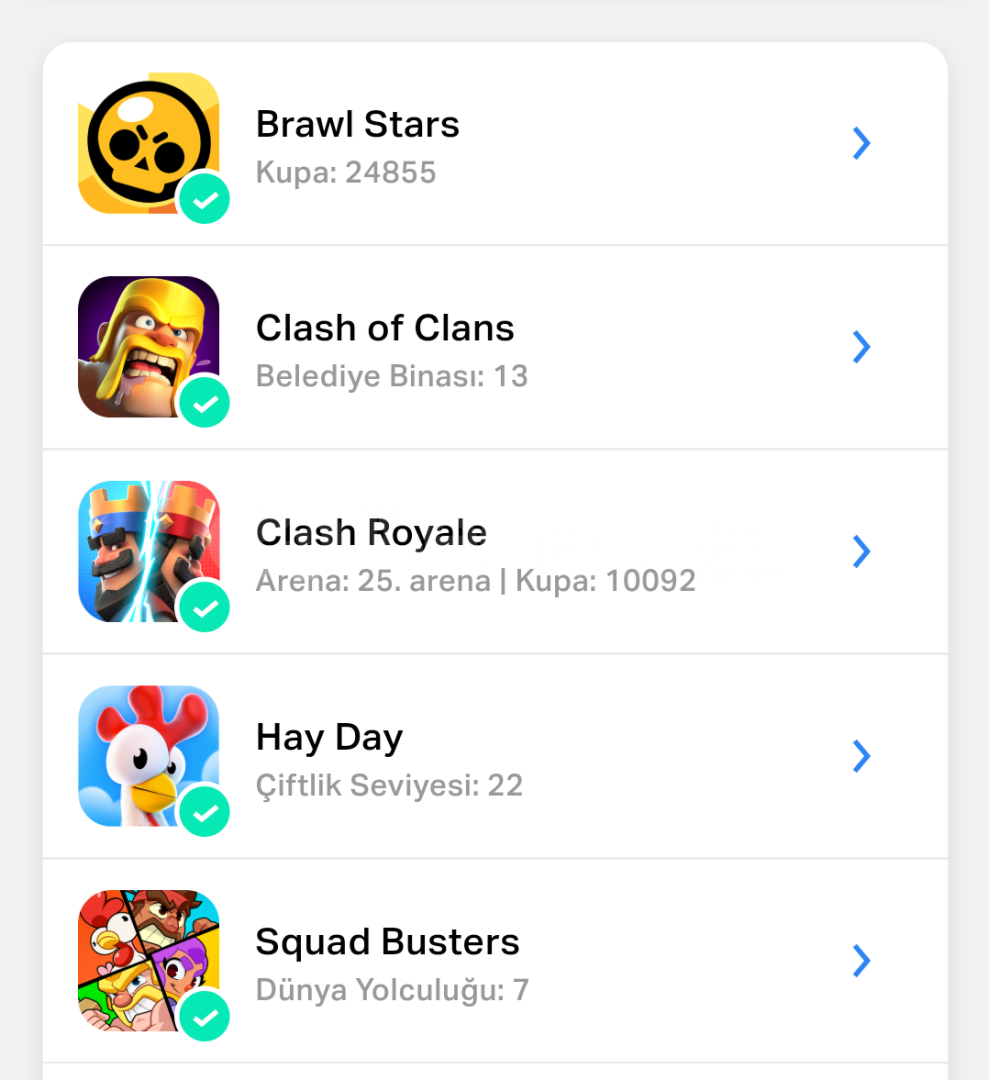 •Clash Royale, Clash Of Clans, Brawl stars, Hayday ve squad busters hesapları mevcut
