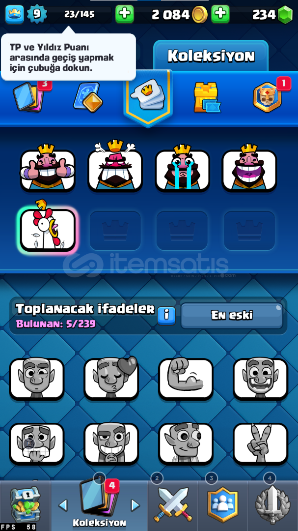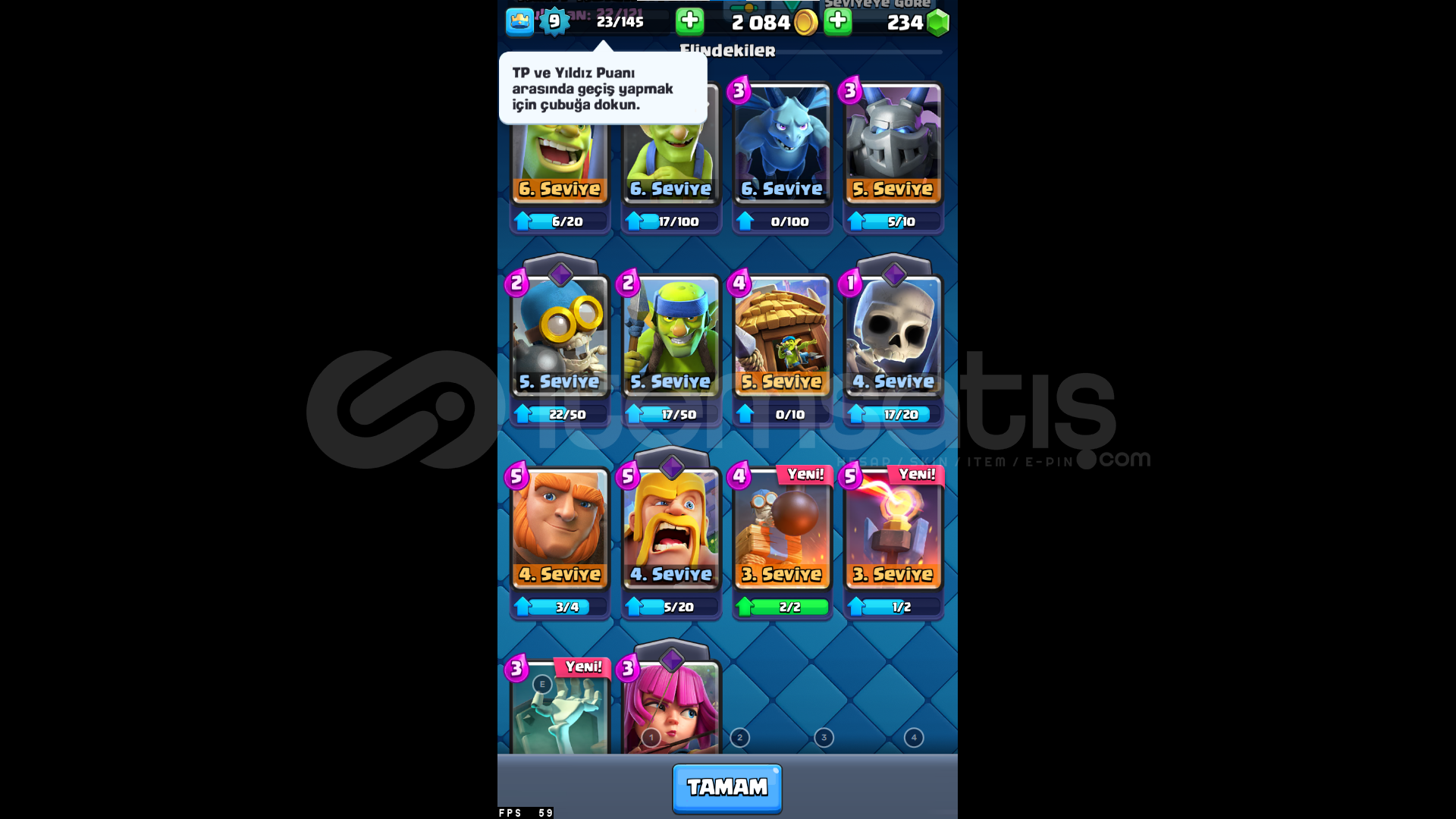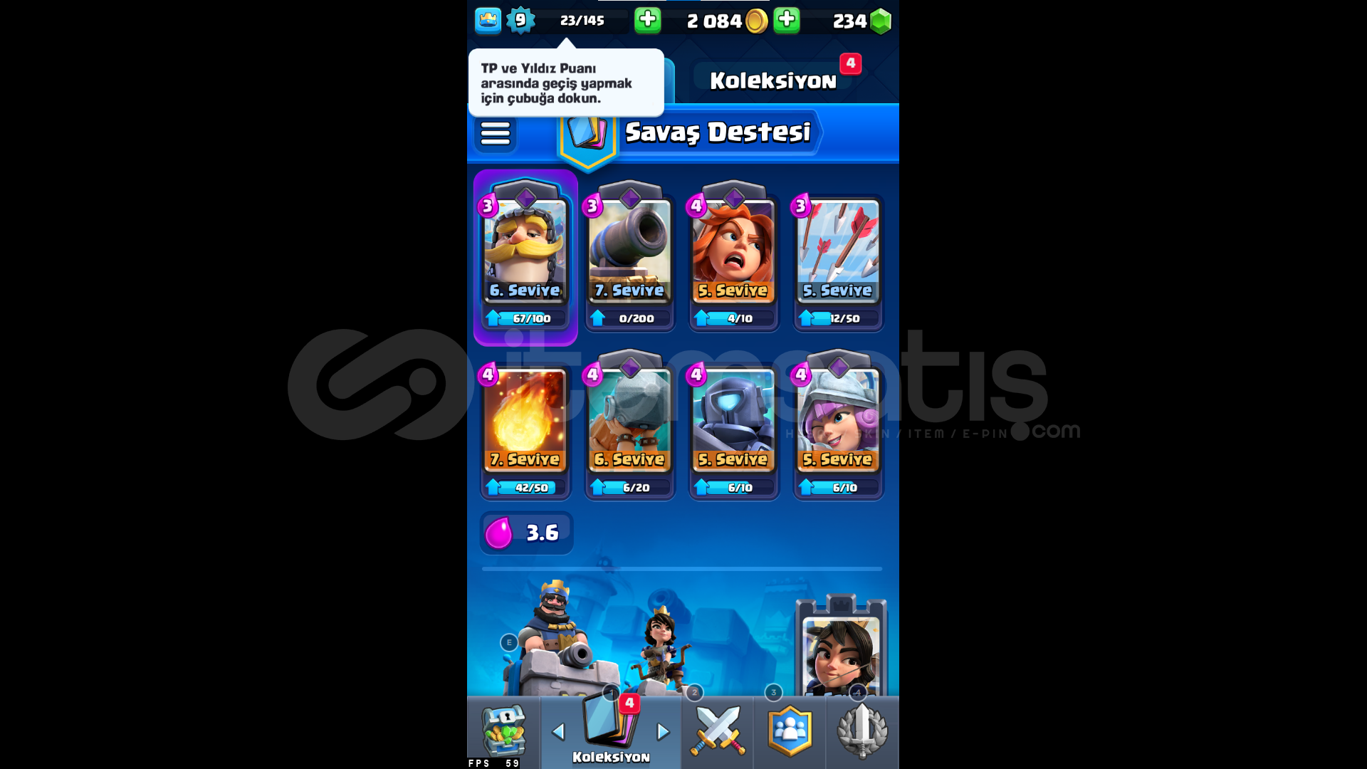 Clash Royale'e yüksek seviyeli kartlarla hızlı bir başlangıç yapmak isteyenler için ideal bir hesaptır.👑 Kral Seviyesi (Level): 9🏆 Kupa Sayısı: 1020 Kupa (Ganimet İskeleti Arenası - Arena 4)💰 Altın Miktarı: 2084💎 Taş (Elmas) Miktarı: 234📝 Not: Pass Royale satın alınmamıştır, ancak ücretsiz kademede ilerleme kaydedilmiştir (8. Sezon, 9/10 K...