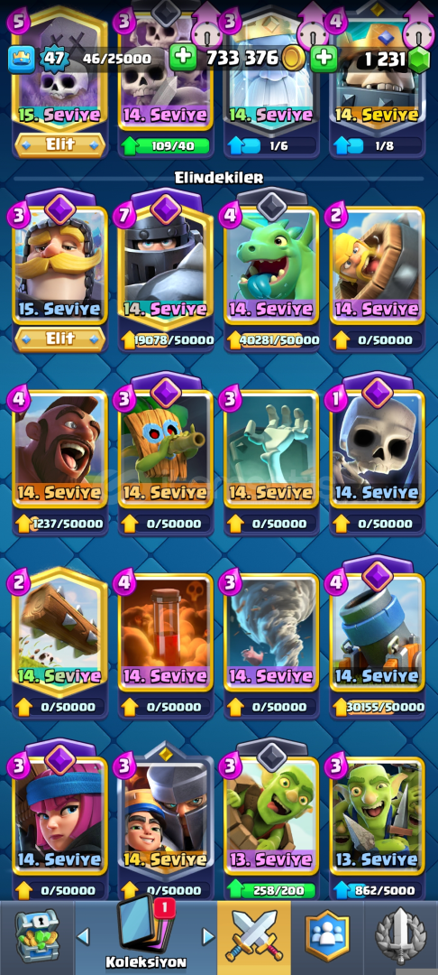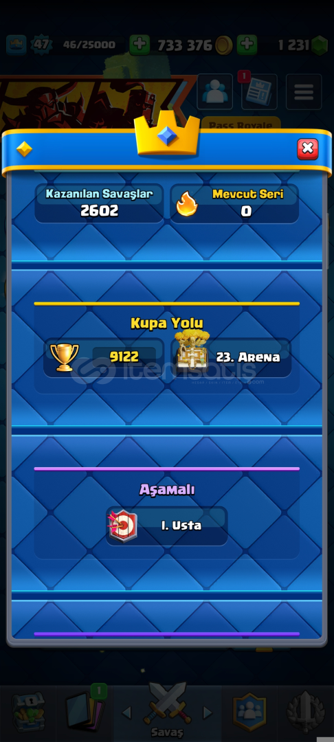 Hesapta mezarlık oynanmıştır log bait ve 2.6 nın kartlarıda yüksek seviye 1200 yeşil taş vardır hesapta