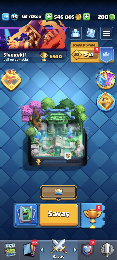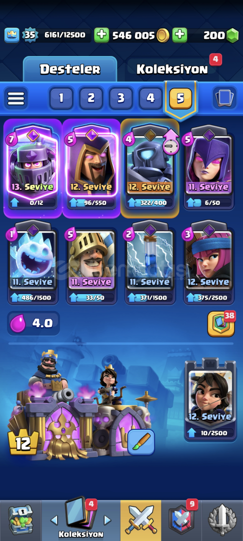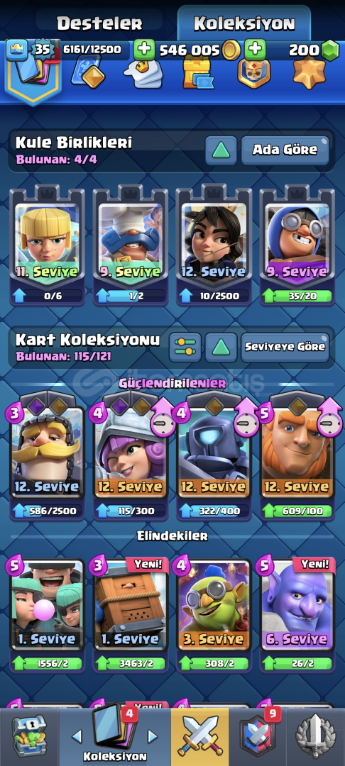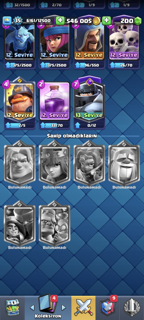 CR hesab 33 seviye 6500 kupa 2 evrim 4 evrim parçasi açık olmayan 5 kart var sadece bütün kule prensleri acik