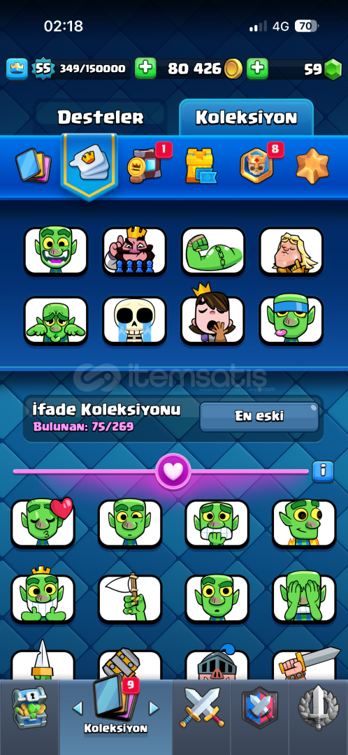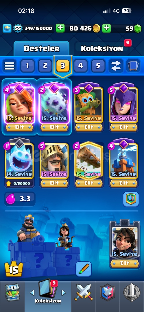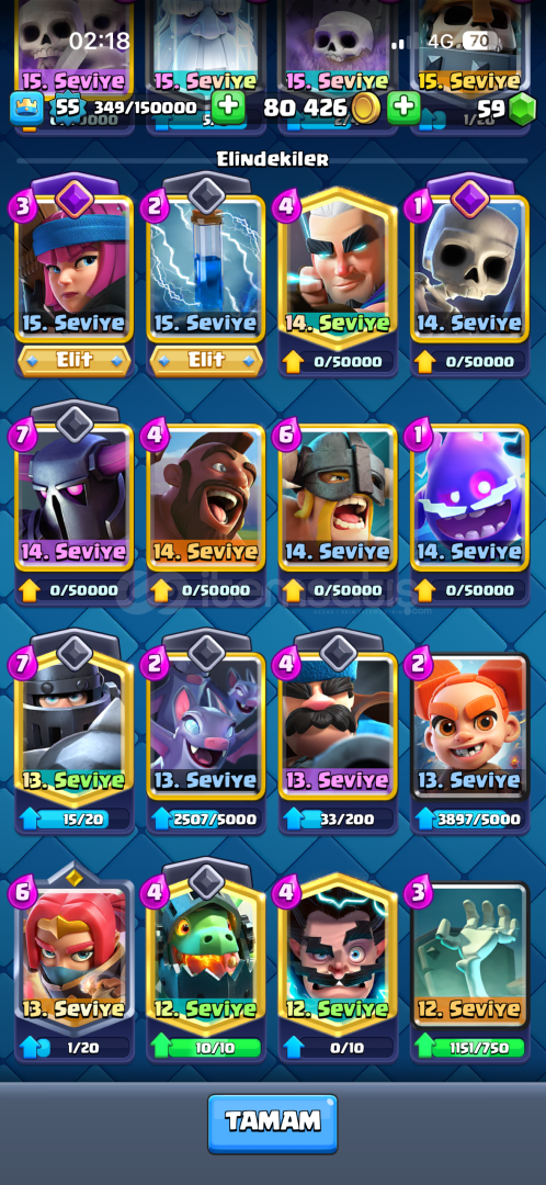Hesap 7 Yıllık HesaptırBütün Kartlar AçıktırDart Goblin (15 Seviye)Kar Topu (15 Seviye)Okçular (12 Seviye)Elektro Ejderha (12 Seviye)Cadı (15 Seviye)Fişekçi (15 Seviye)Tesla (14 Seviye)Valkür (15 Seviye)İskeletler (14 Seviye)Buyucu (11 Seviye)Bombacı (11 Seviye)Oduncu (12 Seviye)(3 Evrim Parçası)Evrimleri açıktır.Hesapta 75 Adet İfade Vardır1 Adet Sıradan Kartlar K...