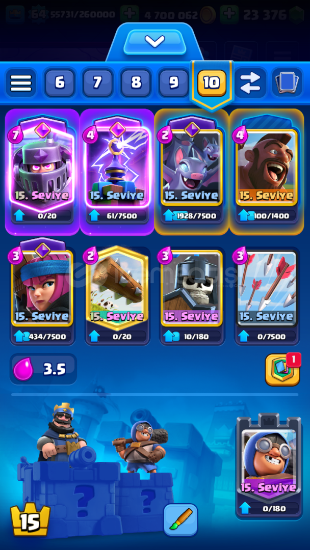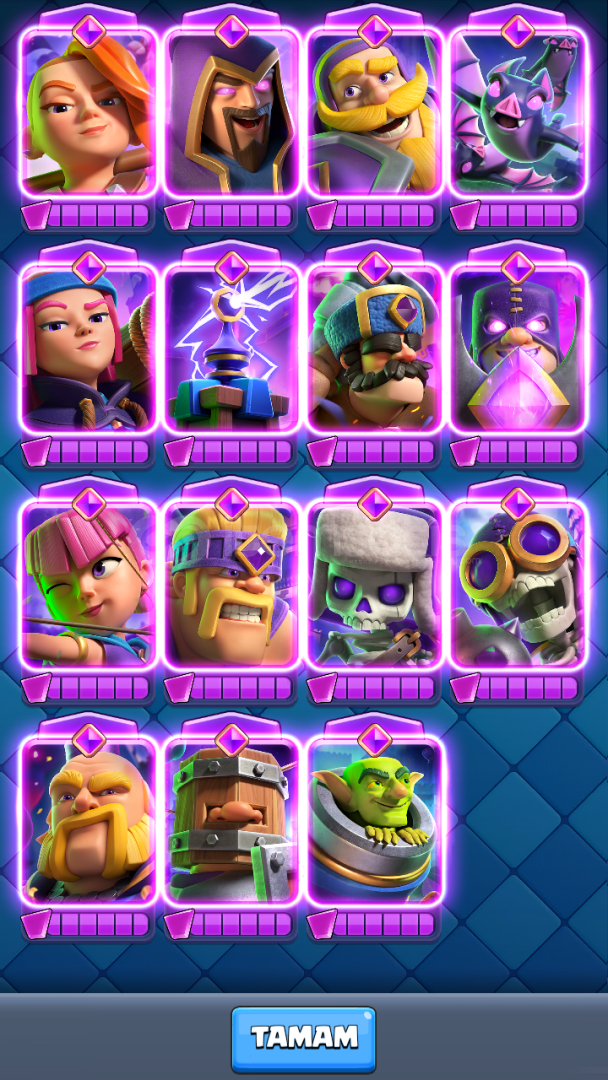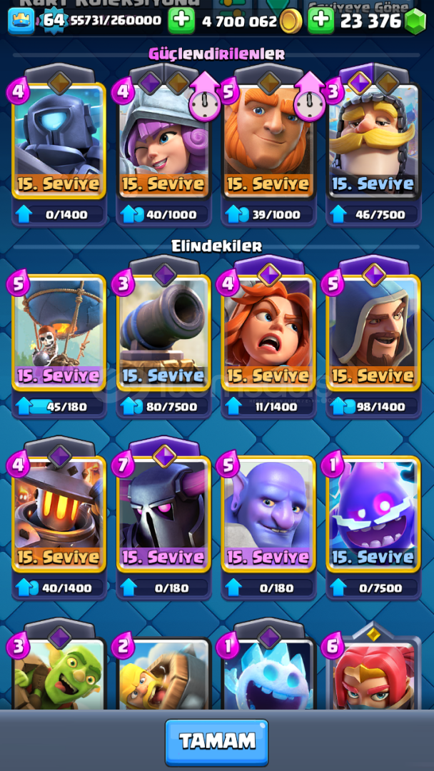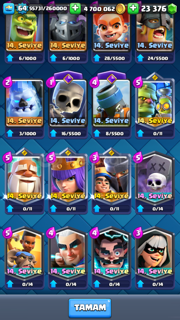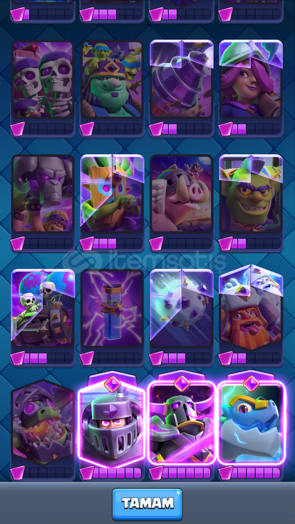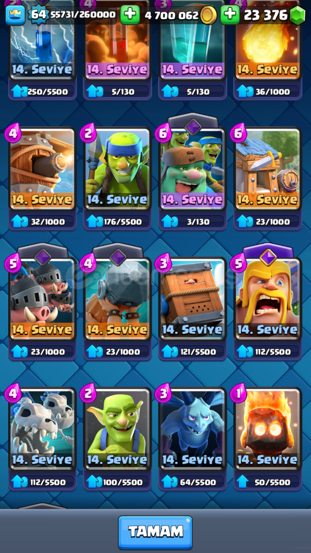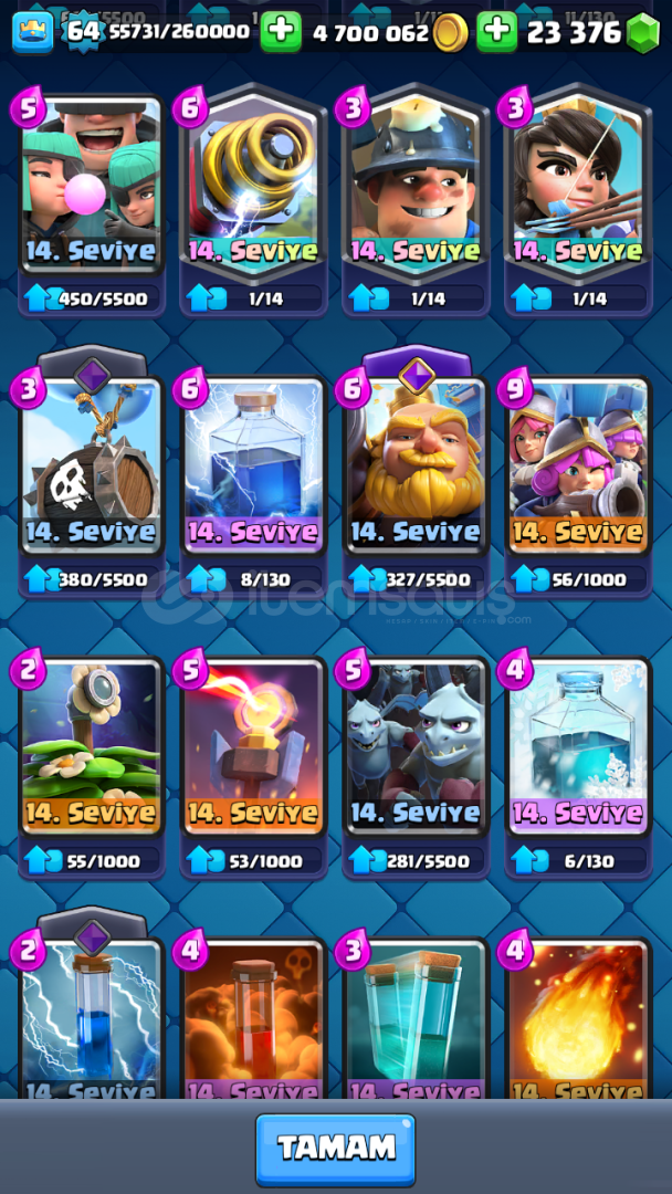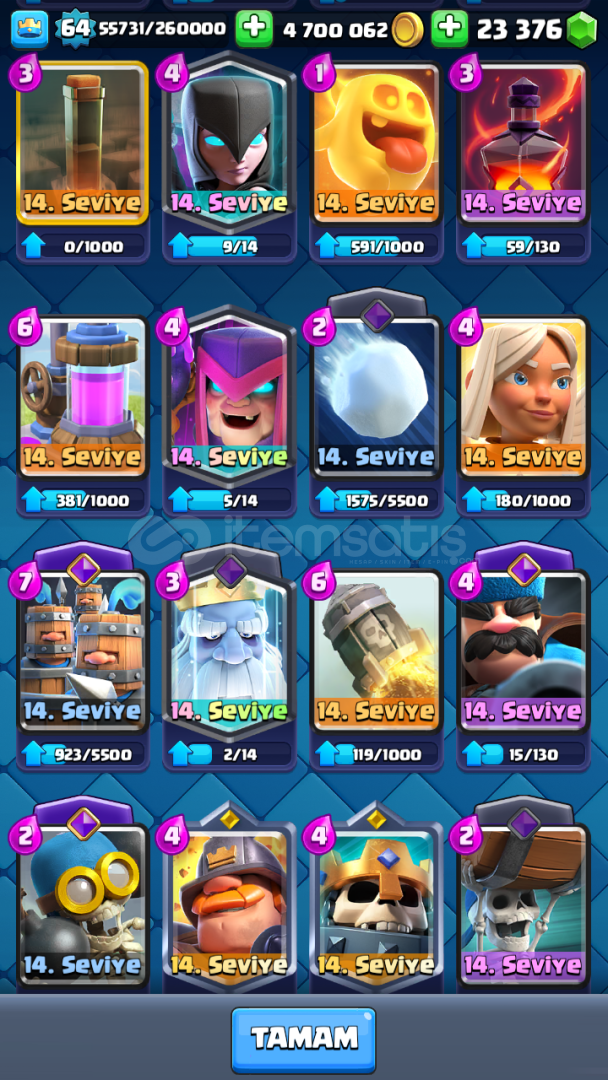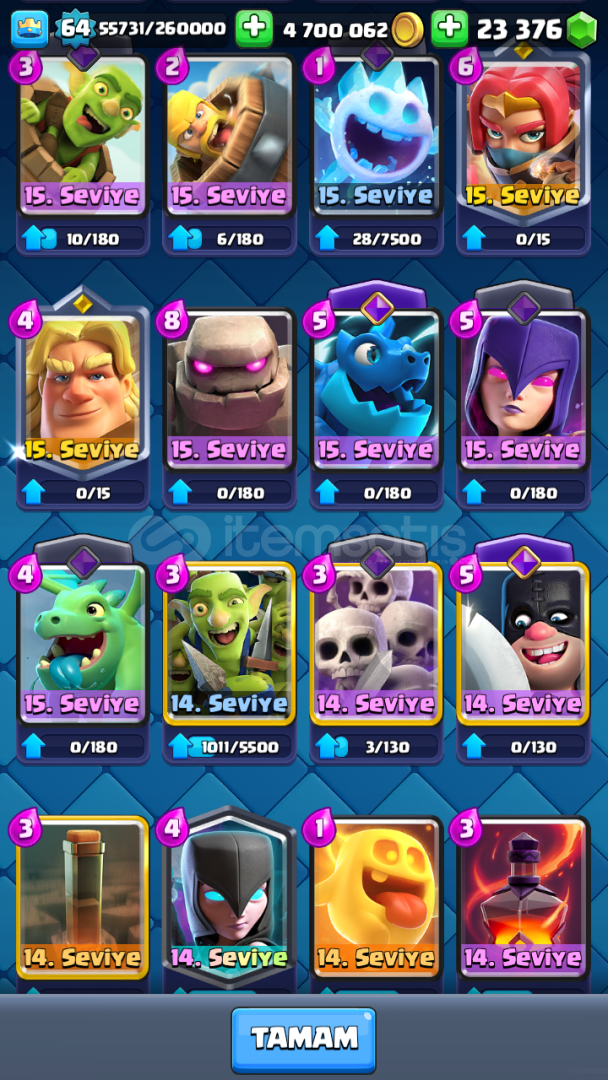 64 level satılık Clash Royal hesabı. Hesapta 5 milyon altın bulunmaktadır.Neredeyse tüm kartlar minimum 14 seviyedir.23,5k yeşil taş.18 Evrim kart var 3 kartı evrim yapacak parça var.Ayni ID üzerinde Brawl stars hesabıda mevcut full açık karakterli bol köstümlü.NOT : GECE YAPILAN ALIM İÇİN TESLİMAZ ZAMANI 08.00 DEN SONRADIR.