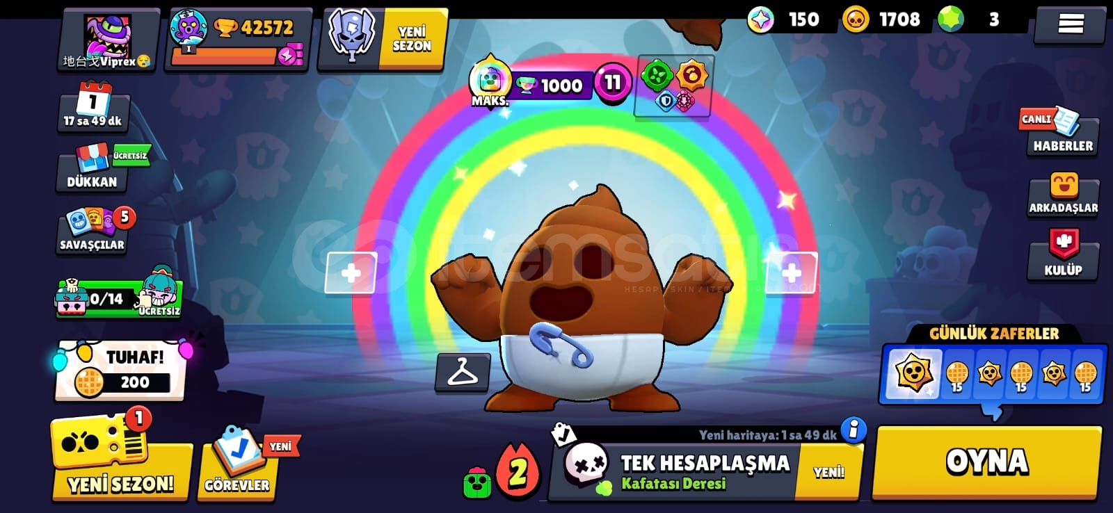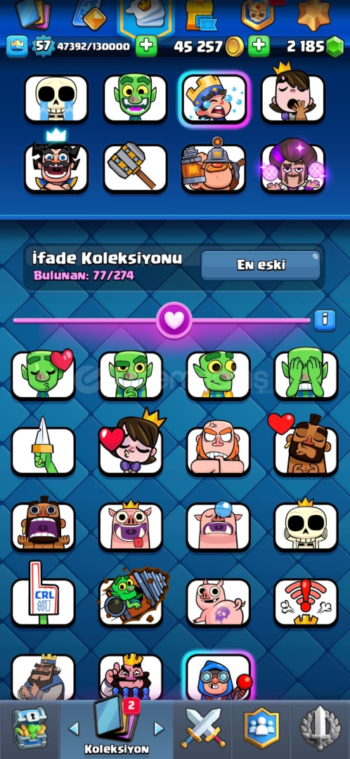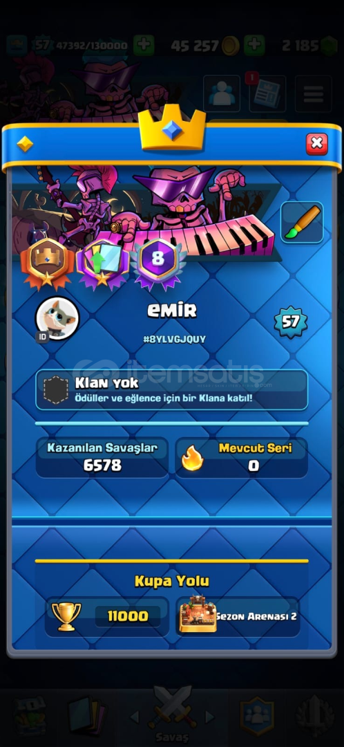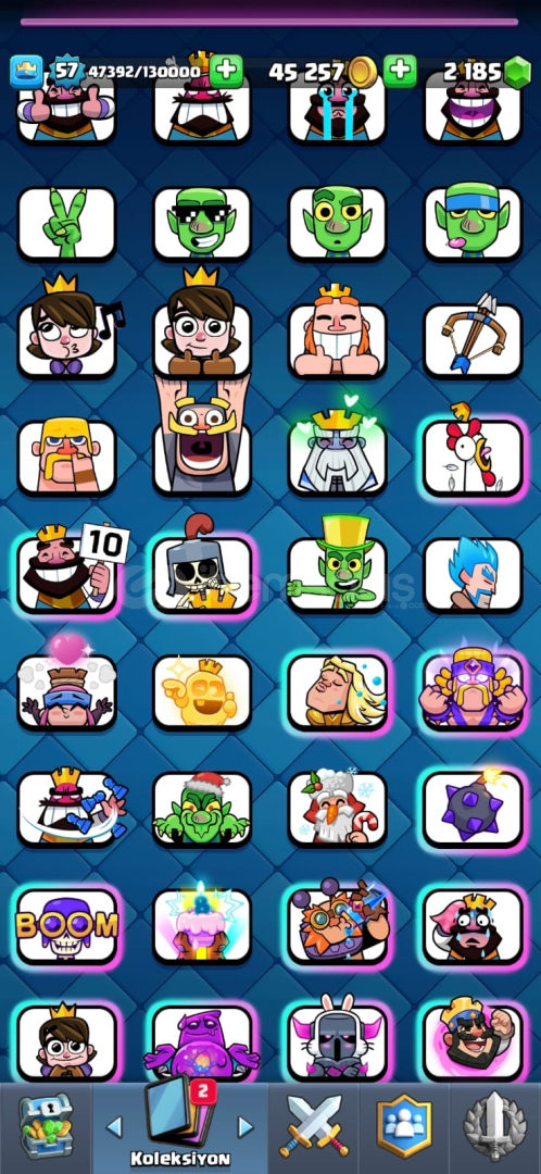 DETAYLI BİLGİ İÇİN DMHesap 10000 Kupadır.13000 Kupa görmüştür.77 Emoji vardır12 Evrim.20 Elit kart vardır.PAZARLIK YAPILIR
