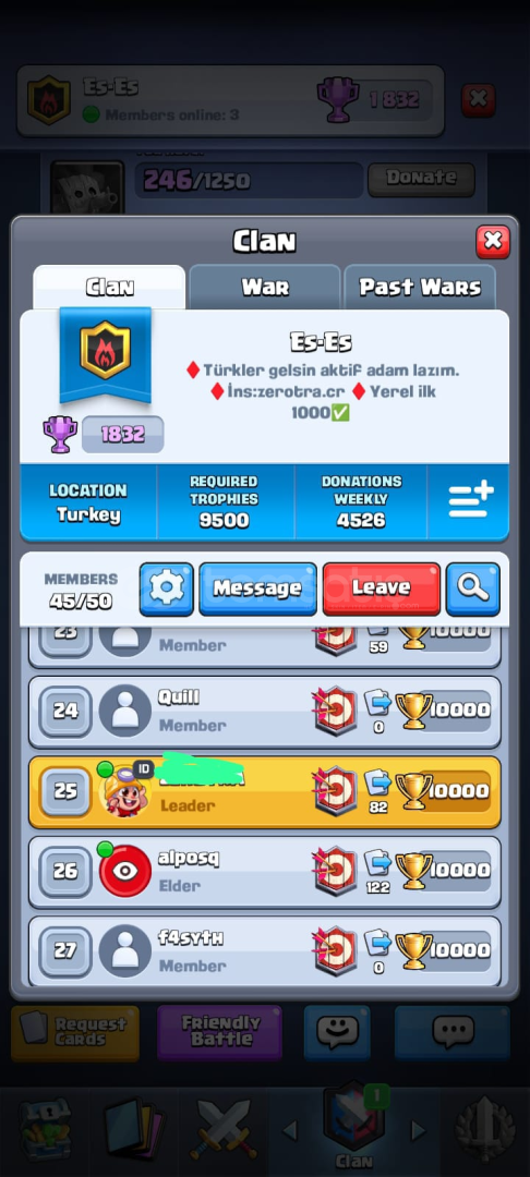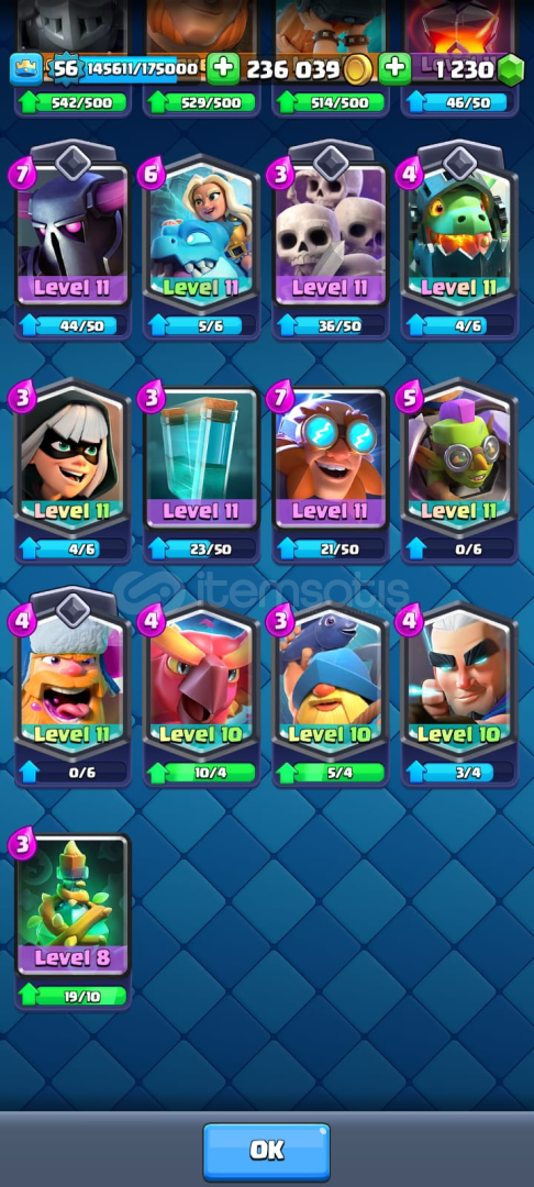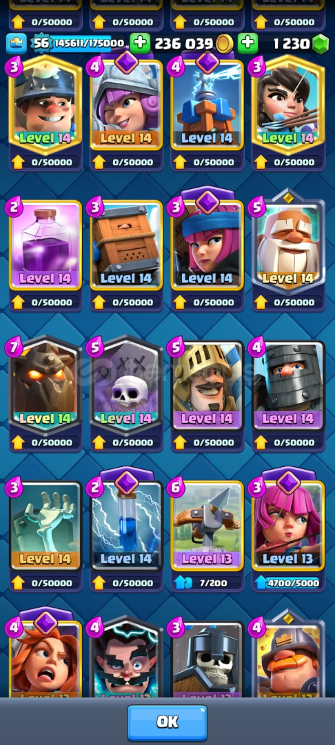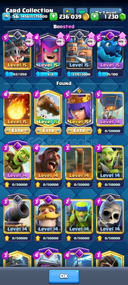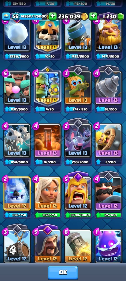15 bin kupaya çıkımış hesap her sezon sıfırlanıyo bildiğiniz üzere alcak arkadaşla anlaşırsak şuan 11 bin 15 bin yapar veririm 13 tane elit level(max) 23 tane 14 level kart var diğer kartlardada 11 aşşağısı yok genelde 12 13 level 15 tanede evrim var nerdeyse 150 ye yakın emoji var birde bu hesap yerel ilk 700lerde olan bir klanın lideri isteyen klanla beraber alır istemesse indirim yaparım klansız alır. he bide hesapta 1230 taş var. adımı supercell banlıyo diye sansurledim akiniza baska seyler gelmesin