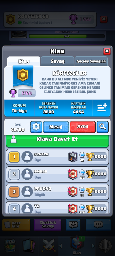 Klanimiz elit saygılı klan savaşlarına katılım sağlayan bağış yapan üyelerden oluşur aldım diye 1453 TL kardeşim