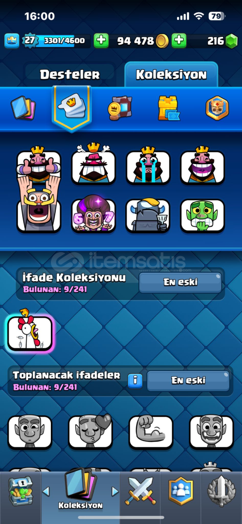 Hesabımız 27 Kral seviyesi ile birlikte 3661 KupadırBaşlangıç için uygundur121 karttan toplam 88 kart mevcuttur(mevcut olmayan kartlar fotoğraflarda bulunuyor)8 ifadesi vardır ayrıca 216 taş/94k altını bulunmaktadırMail sizin üstünüze yapılacaktır kişisel mail değil satılık hesap maili üzerine kayıtlıdır sadece sizde bulunacaktırTekrardan satın alan...
