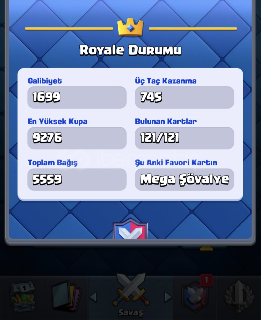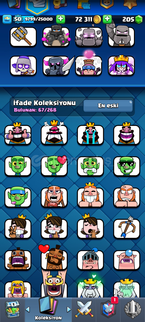 Clash royale 9300 Kupa Tum karakterler var 7 evrim var Emojiler ve flamalar fazla Bilgi icin Dm