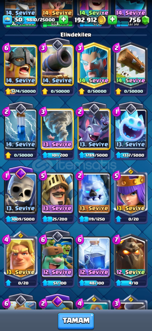 Hesap fişekçi ve pekka olmak üzere 2 EVRİM bulunur elit kartlar dışında 14 seviye olan 5-6 tane kartı vardır almadan önce mesaj atınız pazarlığa açığım.Hesabı e posta ve şifre olmak üzere üstünüze alabilirsiniz hesap komple sizin olacak hesap koruması aktif değildir(telefon baglı degil )