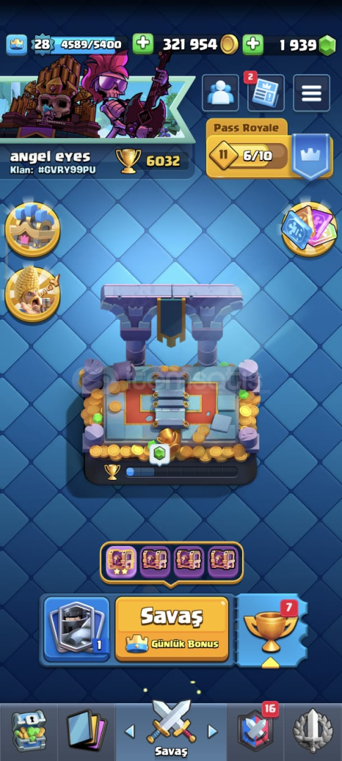 clash royale 6030 kupalı 10 level, 28 seviyeevrimli cehnnem ejderhası 1939 elmas ve 320k gold maille devredilecektir alıcısın...