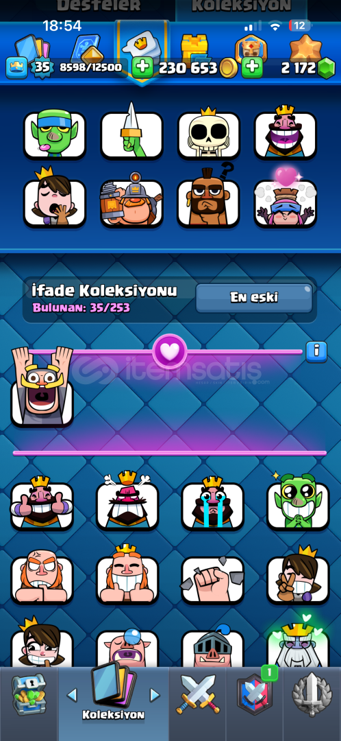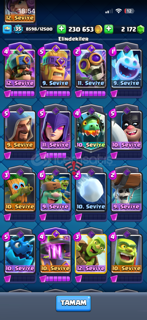 Hesapta sadece 2 karakter yoktur 2100 taş mevcut 7300 kupa mail değiştirilebilir 5 evrim var cadı evrimi için 1 tane kaldı. top evrimi de var