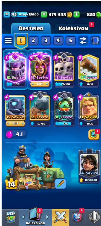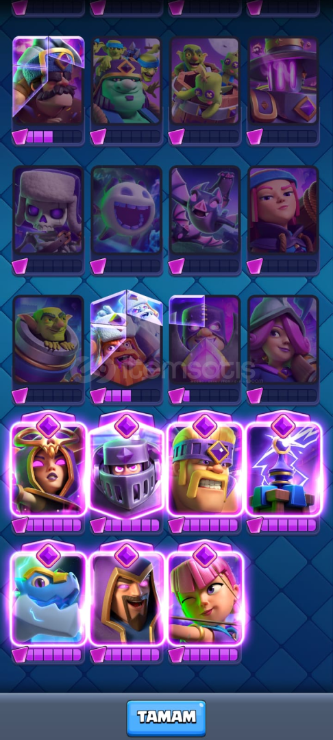 Clash Royale Cadı + Mega Şovalye Evrimi 8200KPKupa 8250Kupa43SEVİYE8EvrimlerCadı 15 SVYMega Şovalye12SVYBarbarlarTesla KulesiElektro EjderhaOkçularYüksek Seviye Pekka 15SVY ELİTCadı 15SVY Elit2KArakter Hariç Bütün Karakterler Var
