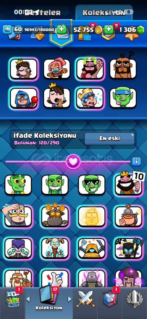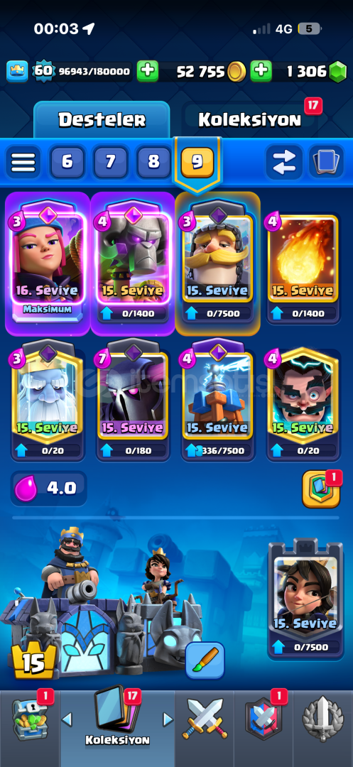 15 k görmüş hesap şuan 12300 kupa 60 lvl 9 yıllık 120 emoji ve efsanevi 30 yakın emoji vardır nadir nihai gorm...